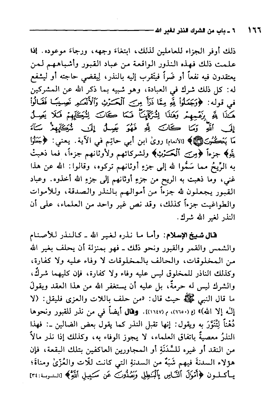 ذلك أوفر الجزاء للعاملين لذلك، ابتغاء وجهه، ورجاء موعوده. إذا علمت ذلك فهذه النذور الواقعة من عباد القبور وأشباههم لمن يعتقدون فيه نفعًا أو ضرًا فيتقرب إليه بالنذر، ليقضي حاجته أو ليشفع له. كل ذلك شرك في العبادة، وهو شبيه بما ذكر الله عن المشركين في قوله: {وَجَعَلُوا لِلَّهِ مِمَّا ذَرَأَ مِنَ الْحَرْثِ وَالأَنْعَامِ نَصِيباً فَقَالُوا هَذَا لِلَّهِ بِزَعْمِهِمْ وَهَذَا لِشُرَكَائِنَا فَمَا كَانَ لِشُرَكَائِهِمْ فَلا يَصِلُ إِلَى اللَّهِ وَمَا كَانَ لِلَّهِ فَهُوَ يَصِلُ إِلَى شُرَكَائِهِمْ سَاءَ مَا يَحْكُمُونَ} 1. روى ابن أبي حاتم في الآية. يعني: جعلوا لله جزءًا من الحرث ولشركائهم ولأوثانهم جزءًا، فما ذهبت به الريح مما سموا لله إلى جزء أوثانهم تركوه، وقالوا: الله عن هذا غني، وما ذهبت به الريح من جزء أوثانهم إلى جزء الله أخذوه.