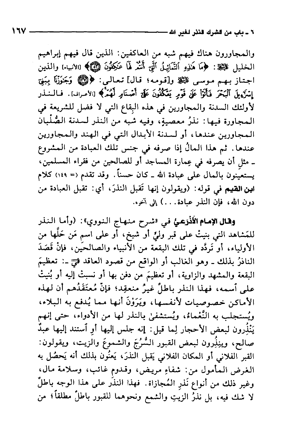 وقال الإمام الأذرعي " في شرح منهاج النووي": وأما النذر للمشاهد التي بنيت على قبر ولي أو شيخ، أو على اسم من حلها من الأولياء، أو تردد في تلك البقعة من الأنبياء والصالحين، فإن قصد الناذر بذلك وهو الغالب أو الواقع من قصود العاقد تعظيم البقعة والمشهد والزاوية، أو تعظيم من دفن بها أو نسبت إليه، أو بنيت على اسمه، فهذا النذر باطل غير منعقد، فإن معتقدهم أن لهذه الأماكن خصوصيات لأنفسها، ويرون أنها مما يدفع به البلاء، ويستجلب به النعماء، ويستشفى بالنذر لها من الأدواء، حتى إنهم ينذرون لبعض الأحجار لما قيل: إنه جلس إليها أو استند إليها عبد صالح، وينذرون لبعض القبور السرج والشموع والزيت، ويقولون: القبر الفلاني أو المكان الفلاني يقبل النذر، يعنون بذلك أنه يحصل به الغرض المأمول من شفاء مريض، وقدوم غائب، وسلامة مال، وغير ذلك من أنواع نذر المجازاة.