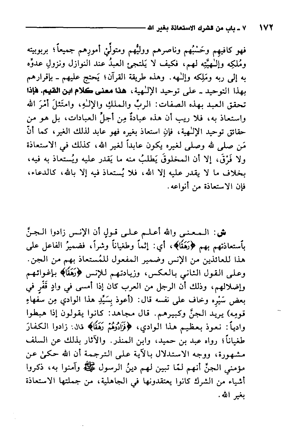 والآثار بذلك عن السلف مشهورة، ووجه الاستدلال بالآية على الترجمة أن الله حكى عن مؤمني الجن أنهم لما تبين لهم دين الرسول صلى الله عليه وسلم وآمنوا به، ذكروا أشياء من الشرك كانوا يعتقدونها في الجاهلية، من جملتها الاستعاذة بغير الله.