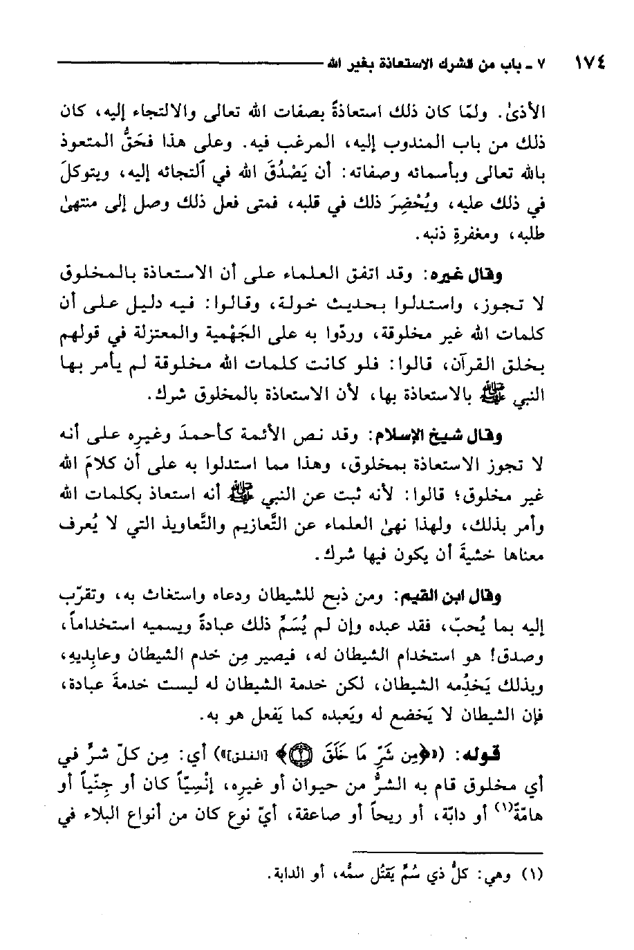 وقال شيخ الإسلام: وقد نص الأئمة كأحمد وغيره على أنه لا تجوز الاستعاذة بمخلوق، وهذا مما استدلوا به على أن كلام الله غير مخلوق. قالوا: لأنه ثبت عن النبي صلى الله عليه وسلم أنه استعاذ بكلمات الله وأمر بذلك، ولهذا نهى العلماء عن التعازيم والتعاويذ التي لا يعرف معناها خشية أن يكون فيها شرك.