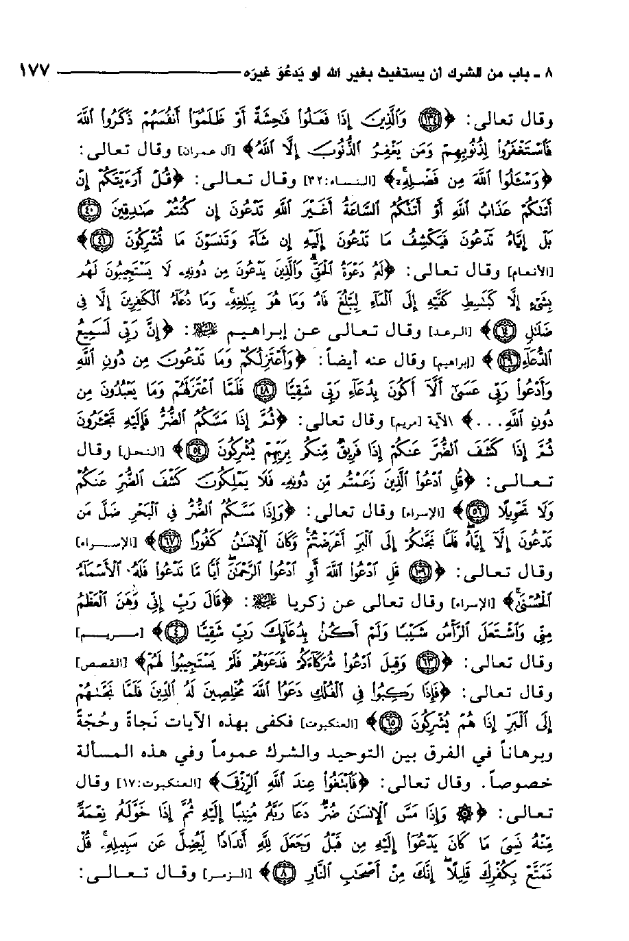 وقال تعالى: {لَهُ دَعْوَةُ الْحَقِّ وَالَّذِينَ يَدْعُونَ مِنْ دُونِهِ لا يَسْتَجِيبُونَ لَهُمْ بِشَيْءٍ إِلاَّ كَبَاسِطِ كَفَّيْهِ إِلَى الْمَاءِ لِيَبْلُغَ فَاهُ وَمَا هُوَ بِبَالِغِهِ وَمَا دُعَاءُ الْكَافِرِينَ إِلاَّ فِي ضَلالٍ} 4. وقال تعالى: عن إبراهيم عليه السلام: {إِنَّ رَبِّي لَسَمِيعُ الدُّعَاءِ} 5. وقال عنه أيضًا: {وَأَعْتَزِلُكُمْ وَمَا تَدْعُونَ مِنْ دُونِ اللَّهِ وَأَدْعُو رَبِّي عَسَى أَلَّا أَكُونَ بِدُعَاءِ رَبِّي شَقِيّاً فَلَمَّا اعْتَزَلَهُمْ وَمَا يَعْبُدُونَ مِنْ دُونِ اللَّهِ ... } 6. وقال تعالى: {ثُمَّ إِذَا مَسَّكُمُ الضُّرُّ فَإِلَيْهِ تَجْأَرُونَ ثُمَّ إِذَا كَشَفَ الضُّرَّ عَنْكُمْ إِذَا فَرِيقٌ مِنْكُمْ بِرَبِّهِمْ يُشْرِكُونَ} 7.8. وقال تعالى: {قُلِ ادْعُوا الَّذِينَ زَعَمْتُمْ مِنْ دُونِهِ فَلا يَمْلِكُونَ كَشْفَ الضُّرِّ عَنْكُمْ وَلا تَحْوِيلاً} 9. وقال تعالى: {وَإِذَا مَسَّكُمُ الضُّرُّ فِي الْبَحْرِ ضَلَّ مَنْ تَدْعُونَ إِلاَّ إِيَّاهُ فَلَمَّا نَجَّاكُمْ إِلَى الْبَرِّ أَعْرَضْتُمْ وَكَانَ الأِنْسَانُ كَفُوراً} 10. وقال تعالى: {قُلِ ادْعُوا اللَّهَ أَوِ ادْعُوا الرَّحْمَنَ أَيّاً مَا تَدْعُوا فَلَهُ الأَسْمَاءُ الْحُسْنَى} 11. وقال تعالى عن زكريا عليه السلام: {قَالَ رَبِّ إِنِّي وَهَنَ الْعَظْمُ مِنِّي وَاشْتَعَلَ الرَّأْسُ شَيْباً وَلَمْ أَكُنْ بِدُعَائِكَ رَبِّ شَقِيّاً} 12. وقال تعالى: {وَقِيلَ ادْعُوا شُرَكَاءَكُمْ فَدَعَوْهُمْ فَلَمْ يَسْتَجِيبُوا لَهُمْ} 13. وقال تعالى: {فَإِذَا رَكِبُوا فِي الْفُلْكِ دَعَوُا اللَّهَ مُخْلِصِينَ لَهُ الدِّينَ فَلَمَّا نَجَّاهُمْ إِلَى الْبَرِّ إِذَا هُمْ يُشْرِكُونَ} 14. فكفى بهذه الآيات نجاة وحجة وبرهانًا في الفرق بين التوحيد والشرك عمومًا وفي هذه المسألة خصوصًا.