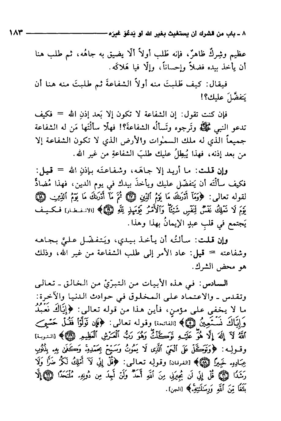 وإن قلت: ما أريد إلا جاهه، وشفاعته بإذن الله. قيل: فكيف سألته أن يتفضل عليك ويأخذ بيدك في يوم الدين، فهذا مضاد لقوله تعالى: {وَمَا أَدْرَاكَ مَا يَوْمُ الدِّينِ ثُمَّ مَا أَدْرَاكَ مَا يَوْمُ الدِّينِ يَوْمَ لا تَمْلِكُ نَفْسٌ لِنَفْسٍ شَيْئًا وَالأَمْرُ يَوْمَئِذٍ لِلَّهِ} 1. فكيف يجتمع في قلب عبد الإيمان بهذا وهذا؟! وإن قلت: سألته أن يأخذ بيدي، ويتفضل علي بجاهه وشفاعته. قيل: عاد الأمر إلى طلب الشفاعة من غير الله، وذلك هو محض الشرك.