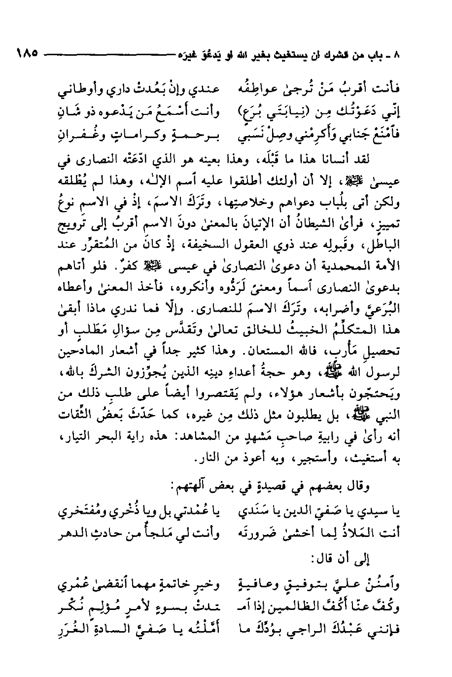 وهذا كثير جدًّا في أشعار المادحين لرسول الله صلى الله عليه وسلم وهو حجة أعداء دينه الذين يجوزون الشرك بالله، ويحتجون بأشعار هؤلاء، ولم يقتصروا أيضًا على طلب ذلك من النبي صلى الله عليه وسلم بل يطلبون مثل ذلك من غيره، كما حدث بعض الثقاة أنه رأى في رابية صاحب مشهد من المشاهد: هذه راية البحر التيار، به أستغيث، وأستجير، وبه أعوذ من النار.