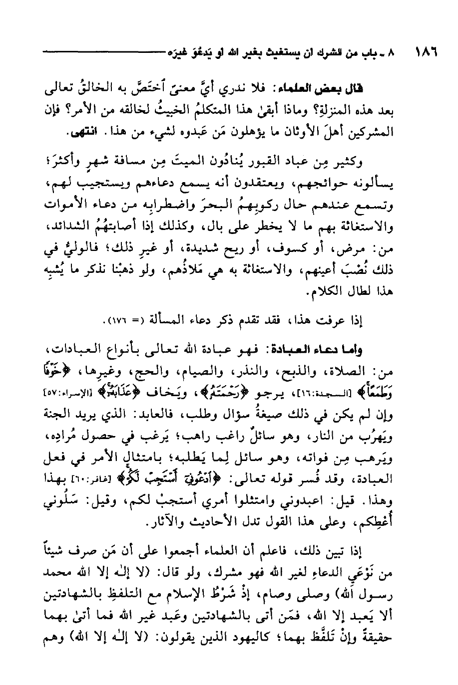 إذا تبين ذلك، فاعلم أن العلماء أجمعوا على أن من صرف شيئًا من نوعي الدعاء لغير الله فهو مشرك، ولو قال لا إله إلا الله محمد رسول الله وصلى وصام، إذ شرط الإسلام مع التلفظ بالشهادتين أن لا يعبد إلا الله، فمن أتى بالشهادتين وعبد غير الله فما أتى بهما حقيقة وإن تلفظ بهما كاليهود الذين يقولون: لا إله إلا الله وهم