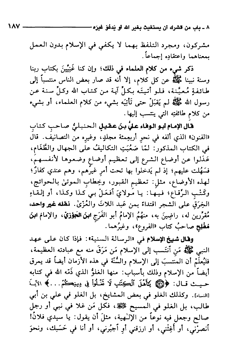 وقال شيخ الإسلام في "الرسالة السنية": فإذا كان على عهد النبي صلى الله عليه وسلم من انتسب إلى الإسلام من مرق منه مع عبادته العظيمة، فليعلم أن المنتسب إلى الإسلام والسنة في هذه الأزمان أيضًا قد يمرق أيضًا من الإسلام وذلك بأسباب: منها الغلو الذي ذمه الله في كتابه حيث قال: {يَا أَهْلَ الْكِتَابِ لا تَغْلُوا فِي دِينِكُمْ ... } 1. وكذلك الغلو في بعض المشايخ، بل الغلو في علي بن أبي طالب، بل الغلو في المسيح عليه السلام، فكل من غلا في نبي أو رجل صالح وجعل فيه نوعًا من الإلهية، مثل أن يقول: يا سيدي فلان انصرني، أو أغثني، أو ارزقني أو اجبرني، أو أنا في حسبك، ونحو