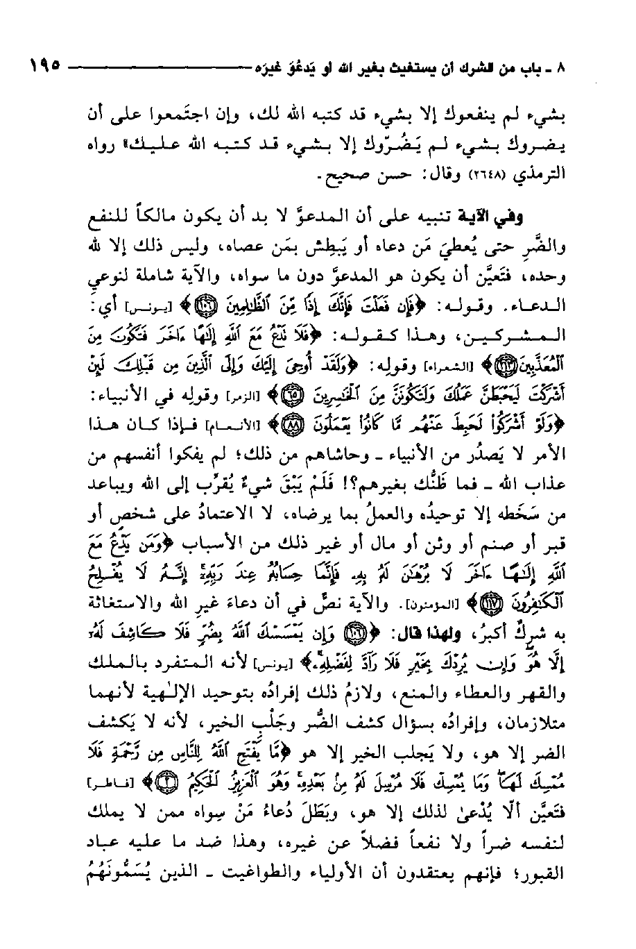 وقوله: {فَإِنْ فَعَلْتَ فَإِنَّكَ إِذًا مِنَ الظَّالِمِينَ} أي المشركين، وهذا كقوله: {فَلا تَدْعُ مَعَ اللَّهِ إِلَهاً آخَرَ فَتَكُونَ مِنَ الْمُعَذَّبِينَ} 2. وقوله: {وَلَقَدْ أُوحِيَ إِلَيْكَ وَإِلَى الَّذِينَ مِنْ قَبْلِكَ لَئِنْ أَشْرَكْتَ لَيَحْبَطَنَّ عَمَلُكَ وَلَتَكُونَنَّ مِنَ الْخَاسِرِينَ} 3. وقوله في الأنعام: {وَلَوْ أَشْرَكُوا لَحَبِطَ عَنْهُمْ مَا كَانُوا يَعْمَلُونَ} 4. فإذا كان هذا الأمر لا يصدر من الأنبياء وحاشاهم من ذلك لم يفكوا أنفسهم من عذاب الله، فما ظنك بغيرهم؟! فلم يبق شيء يقرب إلى الله ويباعد من سخطه إلا توحيده والعمل بما يرضاه، لا الاعتماد على شخص أو قبر أو صنم أو وثن أو مال أو غير ذلك من الأسباب {وَمَنْ يَدْعُ مَعَ اللَّهِ إِلَهاً آخَرَ لا بُرْهَانَ لَهُ بِهِ فَإِنَّمَا حِسَابُهُ عِنْدَ رَبِّهِ إِنَّهُ لا يُفْلِحُ الْكَافِرُونَ} 5 والآية. نص في أن دعاء غير الله والاستغاثة به شرك أكبر، ولهذا قال: {وَإِنْ يَمْسَسْكَ اللَّهُ بِضُرٍّ فَلا كَاشِفَ لَهُ إِلاَّ هُوَ وَإِنْ يُرِدْكَ بِخَيْرٍ فَلا رَادَّ لِفَضْلِهِ} 6؛ لأنه المتفرد بالملك والقهر والعطاء والمنع، ولازم ذلك إفراده بتوحيد الإلهية لأنهما متلازمان، وإفراده بسؤال كشف الضر وجلب الخير، لأنه لا يكشف الضر إلا هو، ولا يجلب الخير إلا هو {مَا يَفْتَحِ اللَّهُ لِلنَّاسِ مِنْ رَحْمَةٍ فَلا مُمْسِكَ لَهَا وَمَا يُمْسِكْ فَلا مُرْسِلَ لَهُ مِنْ بَعْدِهِ وَهُوَ الْعَزِيزُ الْحَكِيمُ} 7. فتعين أن لا يدعى لذلك إلا هو، وبطل دعاء من سواه ممن لا يملك لنفسه ضرًّا ولا نفعًا فضلاً عن غيره، وهذا ضد ما عليه عباد القبور، فإنهم يعتقدون أن الأولياء والطواغيت الذي يسمونهم