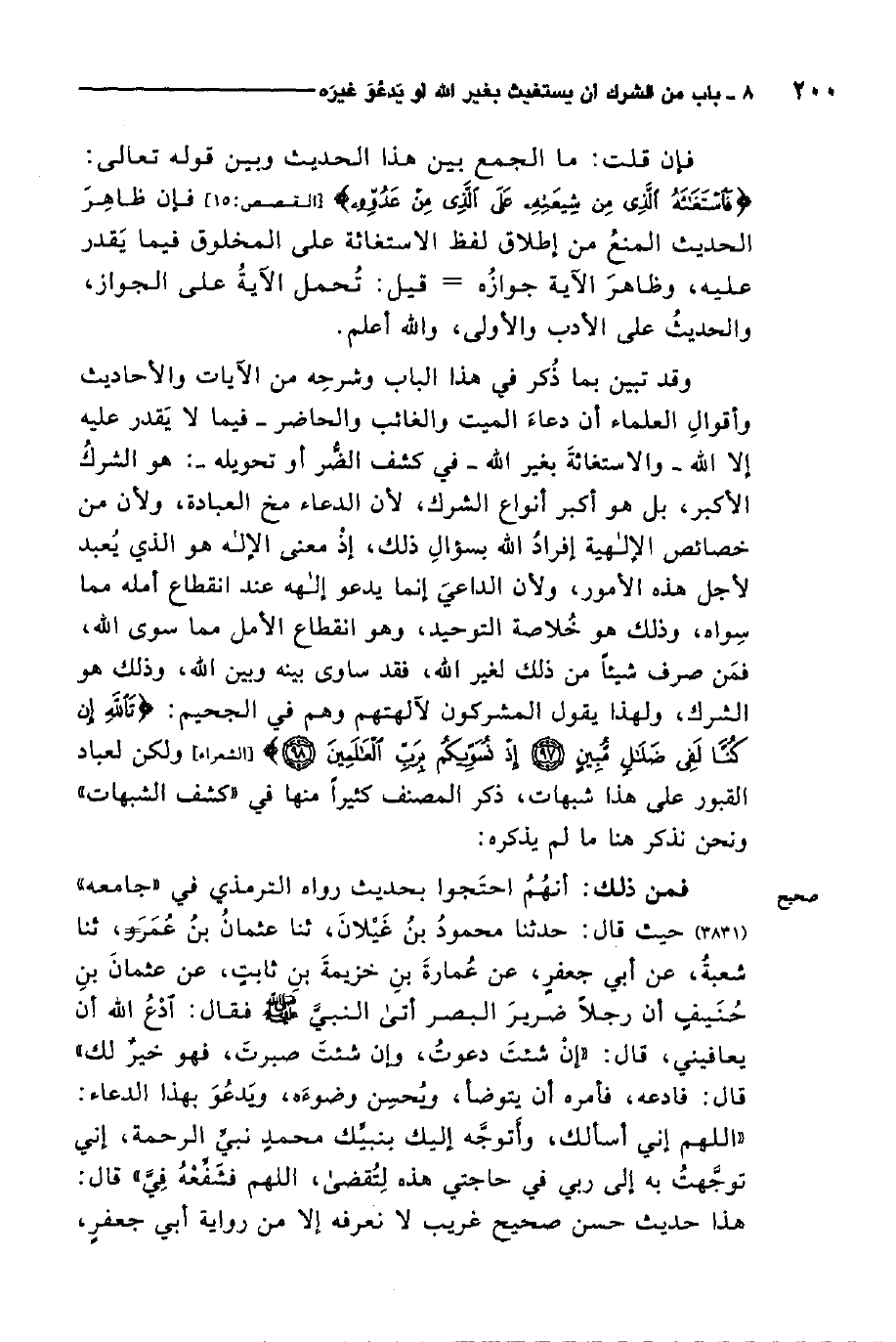 فمن ذلك أنهم احتجوا بحديث رواه الترمذي في "جامعه" حيث قال: حدثنا محمود بن غيلان، ثنا عثمان بن عمرو، ثنا شعبة عن أبي جعفر عن عمارة بن خزيمة بن ثابت عن عثمان بن حُنَيْف "أن رجلاً ضرير البصر أتى النبي صلى الله عليه وسلم فقال: ادع الله أن يعافيني، قال: إن شئت دعوت، وإن شئت صبرت، فهو خير لك قال: فادعه، فأمره أن يتوضأ، ويحسن وضوءه، ويدعو بهذا الدعاء: اللهم إني أسألك، وأتوجه إليك بنبيك محمد نبي الرحمة، إني توجهت به إلى ربي في حاجتي هذه لتقضى، اللهم فشفعه في". قال: هذا حديث حسن صحيح غريب لا نعرفه إلا من رواية أبي جعفر،