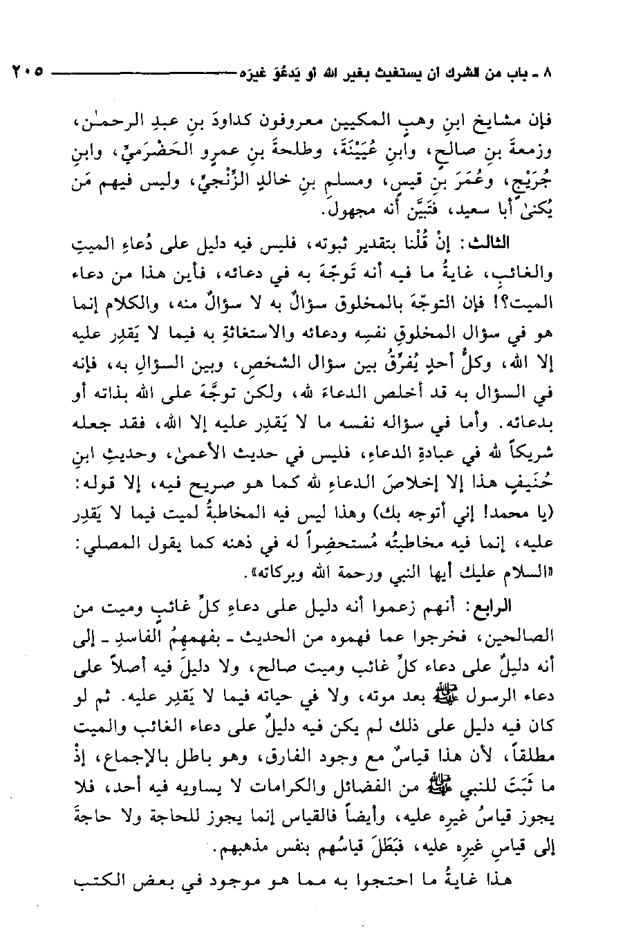 الرابع: أنهم زعموا أنه دليل على دعاء كل غائب وميت من الصالحين، فخرجوا عما فهموه من الحديث بفهمهم الفاسد إلى أنه دليل على دعاء كل غائب وميت صالح، ولا دليل فيه أصلاً على دعاء الرسول صلى الله عليه وسلم بعد موته، ولا في حياته فيما لا يقدر عليه، ثم لو كان فيه دليل على ذلك لم يكن فيه دليل على دعاء الغائب والميت مطلقًا، لأن هذا قياس مع وجود الفارق، وهو باطل بالإجماع، إذ ما ثبت للنبي صلى الله عليه وسلم من الفضائل والكرامات لا يساويه فيه أحد، فلا يجوز قياس غيره عليه، وأيضًا فالقياس إنما يجوز للحاجة ولا حاجة إلى قياس غيره عليه، فبطل قياسهم بنفس مذهبهم، هذا غاية ما احتجوا به مما هو موجود في بعض الكتب