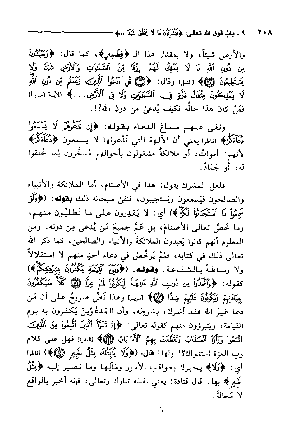 والأرض شيئًا، ولا بمقدار هذا القطمير، كما قال: {وَيَعْبُدُونَ مِنْ دُونِ اللَّهِ مَا لا يَمْلِكُ لَهُمْ رِزْقاً مِنَ السَّمَاوَاتِ وَالْأَرْضِ شَيْئاً وَلا يَسْتَطِيعُونَ} 1. وقال: {قُلِ ادْعُوا الَّذِينَ زَعَمْتُمْ مِنْ دُونِ اللَّهِ لا يَمْلِكُونَ مِثْقَالَ ذَرَّةٍ فِي السَّمَاوَاتِ وَلا فِي الأَرْضِ ... } 2. فمن كان هذا حاله فكيف يدعى من دون الله؟ ونفى عنهم سماع الدعاء بقوله: {إِنْ تَدْعُوهُمْ لا يَسْمَعُوا دُعَاءَكُمْ} 3. يعني أن الآلهة التي تدعونها لا يسمعون دعاءكم؛ لأنهم أموات أو ملائكة مشغولون بأحوالهم مسخرون لما خلقوا له أو جماد، فلعل المشرك يقول: هذا في الأصنام، أما الملائكة والأنبياء والصالحون فيسمعون ويستجيبون، فنفى سبحانه ذلك بقوله: {وَلَوْ سَمِعُوا مَا اسْتَجَابُوا لَكُمْ} ، أي: لا يقدرون على ما تطلبون منهم، وما خص تعالى الأصنام، بل عم جميع مَن يدعى مِن دونه. ومن المعلوم أنهم كانوا يعبدون الملائكة والأنبياء والصالحين، كما ذكر الله تعالى ذلك في كتابه، فلم يرخص في دعاء أحد منهم لا استقلالًا ولا وساطة بالشفاعة.