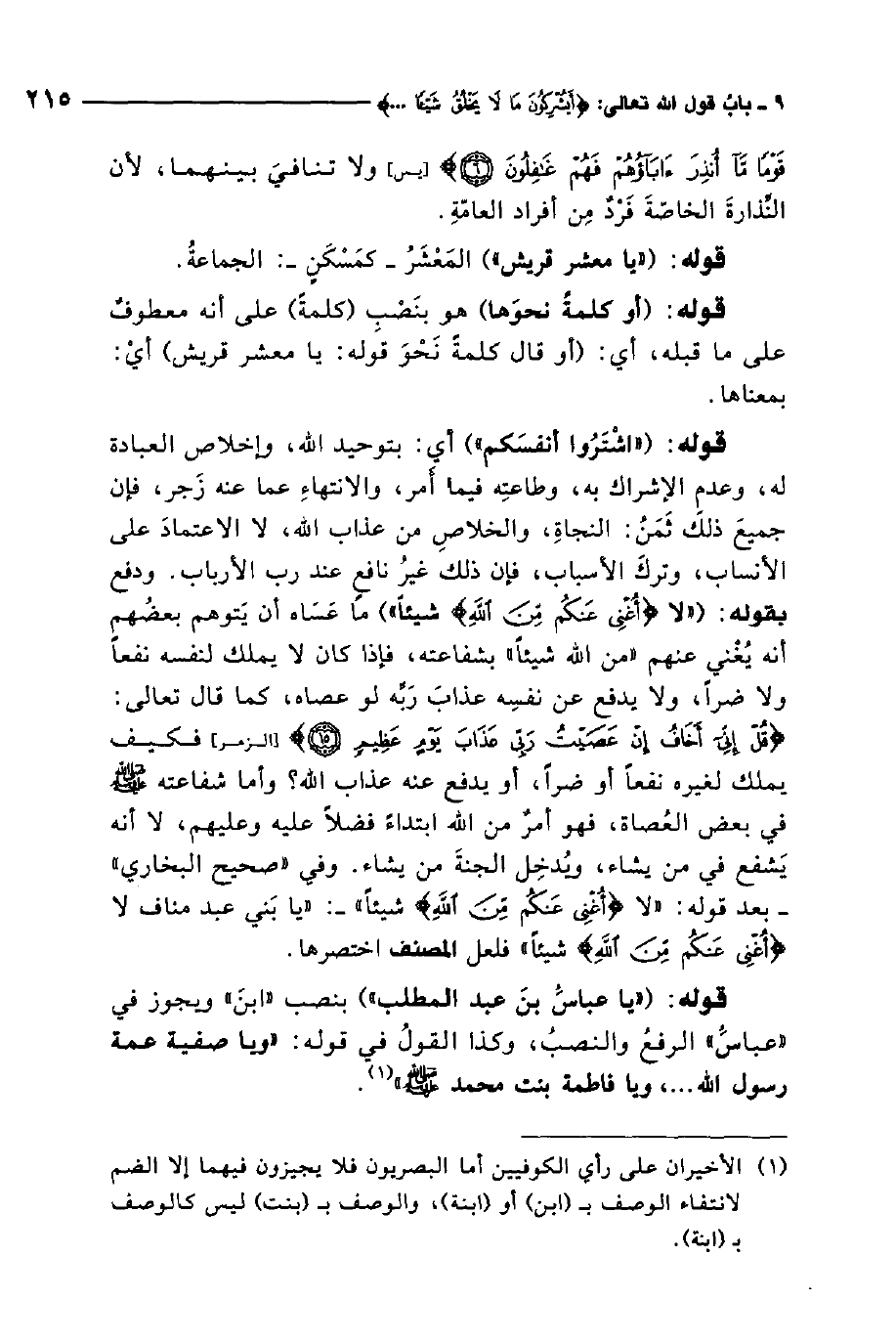 قوله: "يا عباس بن عبد المطلب". بنصب "ابن" ويجوز في "عباس" الرفع والنصب، وكذا القول في قوله: "ويا صفية عمة رسول الله، ويا فاطمة بنت محمد"5 صلى الله عليه وسلم.