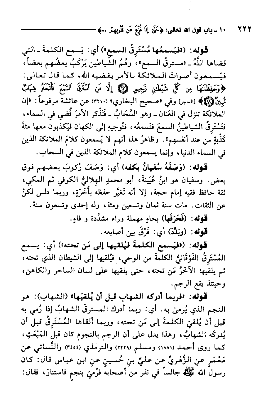 قوله:"فيسمعها مسترق السمع"أي: يسمع الكلمة التي قضاها الله مسترق السمع، وهم الشياطين يركب بعضهم بعضًا، فيسمعون أصوات الملائكة بالأمر يقضيه الله، كما قال تعالى: {وَحَفِظْنَاهَا مِنْ كُلِّ شَيْطَانٍ رَجِيمٍ إِلاَّ مَنِ اسْتَرَقَ السَّمْعَ فَأَتْبَعَهُ شِهَابٌ مُبِينٌ} ، [الحجر الآيتان: 17-18] .وفي "صحيح البخاري" عن عائشة مرفوعًا: "إن الملائكة تنْزل في العنان وهو السحاب، فتذكر الأمر قضي في السماء، فتسترق الشياطين السمع فتسمعه، فتوحيه إلى الكهان فيكذبون معها مائة كذبة من عند أنفسهم" 1. وظاهر هذا أنهم لا يسمعون كلام الملائكة الذين في السماء الدنيا، وإنما يسمعون كلام الملائكة الذين في السحاب.