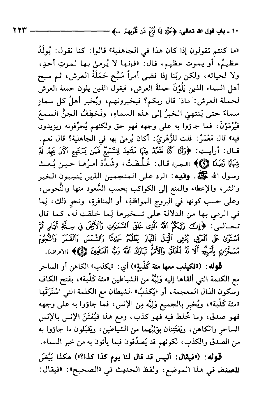 ما كنتم تقولون إذا كان هذا في الجاهلية قالوا: كنا نقول: يولد عظيم، أو يموت عظيم، قال فإنها لا يرمى بها لموت أحد، ولا لحياته، ولكن ربنا إذا قضى أمرًا سبح حملة العرش، ثم سبح أهل السماء الذين يلون حملة العرش، فيقول الذين يلون حملة العرش لحملة العرش: ماذا قال ربكم؟ فيخبرونهم، ويخبر أهل كل سماء سماء حتى ينتهي الخبر إلى هذه السماء، وتخطف الجن السمع فيرمون، فما جاؤوا به على وجهه فهو حق ولكنهم يحرفونه ويزيدون فيه" قال معمر: قلت للزهري: "أكان يرمى بها في الجاهلية؟ قال نعم. قال أرأيت: {وَأَنَّا كُنَّا نَقْعُدُ مِنْهَا مَقَاعِدَ لِلسَّمْعِ فَمَنْ يَسْتَمِعِ الآنَ يَجِدْ لَهُ شِهَاباً رَصَداً} ، [الجن:9] .