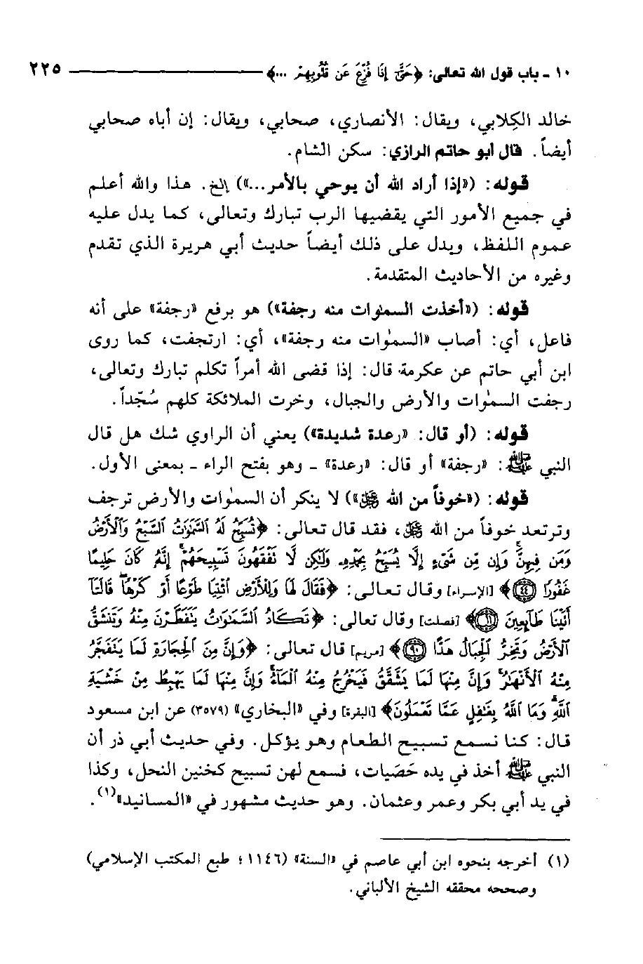 قوله:"خوفا من الله عز وجل".لا ينكر أن السماوات والأرض ترجف وترتعد خوفا من الله عز وجل فقد قال تعالى: {تُسَبِّحُ لَهُ السَّمَاوَاتُ السَّبْعُ وَالأَرْضُ وَمَنْ فِيهِنَّ وَإِنْ مِنْ شَيْءٍ إِلاَّ يُسَبِّحُ بِحَمْدِهِ وَلَكِنْ لا تَفْقَهُونَ تَسْبِيحَهُمْ إِنَّهُ كَانَ حَلِيماً غَفُوراً} 1. وقال تعالى: {فَقَالَ لَهَا وَلِلأَرْضِ ائْتِيَا طَوْعاً أَوْ كَرْهاً قَالَتَا أَتَيْنَا طَائِعِينَ} 2. وقال تعالى: {تَكَادُ السَّمَاوَاتُ يَتَفَطَّرْنَ مِنْهُ وَتَنْشَقُّ الأَرْضُ وَتَخِرُّ الْجِبَالُ هَدّاً} 3. قال تعالى: {وَإِنَّ مِنَ الْحِجَارَةِ لَمَا يَتَفَجَّرُ مِنْهُ الأَنْهَارُ وَإِنَّ مِنْهَا لَمَا يَشَّقَّقُ فَيَخْرُجُ مِنْهُ الْمَاءُ وَإِنَّ مِنْهَا لَمَا يَهْبِطُ مِنْ خَشْيَةِ اللَّهِ وَمَا اللَّهُ بِغَافِلٍ عَمَّا تَعْمَلُونَ} 4.
