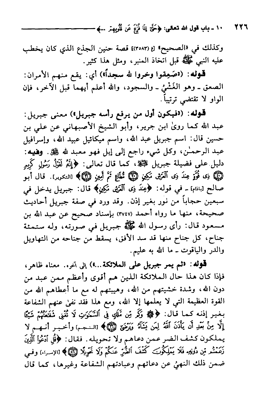 قوله: "ثم يمر جبريل على الملائكة ... " إلى آخره. معناه ظاهر، فإذا كان هذا حال الملائكة الذين هم أقوى وأعظم مِمَّن عُبِدَ من دون الله، وشدة خشيتهم من الله، وهيبتم له مع ما أعطاهم الله من القوة العظيمة التي لا يعلمها إلا الله، ومع هذا فقد نفى عنهم الشفاعة بغير إذنه كما قال: {وَكَمْ مِنْ مَلَكٍ فِي السَّمَاوَاتِ لا تُغْنِي شَفَاعَتُهُمْ شَيْئاً إِلاَّ مِنْ بَعْدِ أَنْ يَأْذَنَ اللَّهُ لِمَنْ يَشَاءُ وَيَرْضَى} 2. وأخبر أنهم لا يملكون كشف الضر عمن دعاهم ولا تحويله. فقال: {قُلِ ادْعُوا الَّذِينَ زَعَمْتُمْ مِنْ دُونِهِ فَلا يَمْلِكُونَ كَشْفَ الضُّرِّ عَنْكُمْ وَلا تَحْوِيلاً} 3. وفي ضمن ذلك النهي عن دعائهم وعبادتهم الشفاعة وغيرها، كما قال