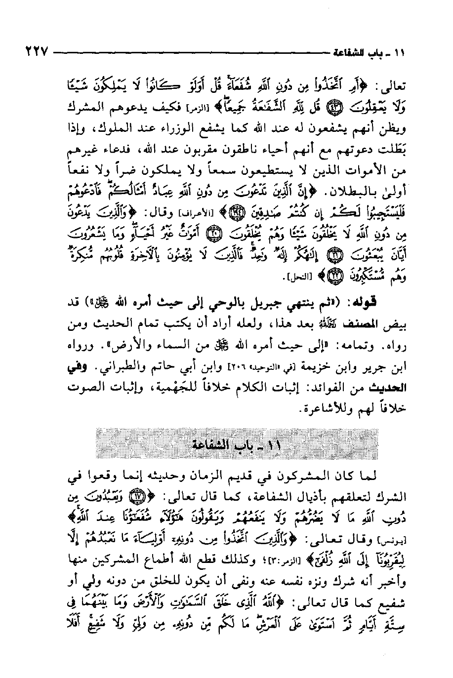 لما كان المشركون في قديم الزمان وحديثه إنما وقعوا في الشرك لتعلقهم بأذيال الشفاعة، كما قال تعالى: {وَيَعْبُدُونَ مِنْ دُونِ اللَّهِ مَا لا يَضُرُّهُمْ وَلا يَنْفَعُهُمْ وَيَقُولُونَ هَؤُلاءِ شُفَعَاؤُنَا عِنْدَ اللَّهِ} 1. وقال تعالى: {وَالَّذِينَ اتَّخَذُوا مِنْ دُونِهِ أَوْلِيَاءَ مَا نَعْبُدُهُمْ إِلَّا لِيُقَرِّبُونَا إِلَى اللَّهِ زُلْفَى} 2. وكذلك قطع الله أطماع المشركين منها، وأخبر أنه شرك، ونزه نفسه عنه، ونفى أن يكون الخلق من دونه ولي أو شفيع، كما قال تعالى: {اللَّهُ الَّذِي خَلَقَ السَّمَاوَاتِ وَالأَرْضَ وَمَا بَيْنَهُمَا فِي سِتَّةِ أَيَّامٍ ثُمَّ اسْتَوَى عَلَى الْعَرْشِ مَا لَكُمْ مِنْ دُونِهِ مِنْ وَلِيٍّ وَلا شَفِيعٍ أَفَلا