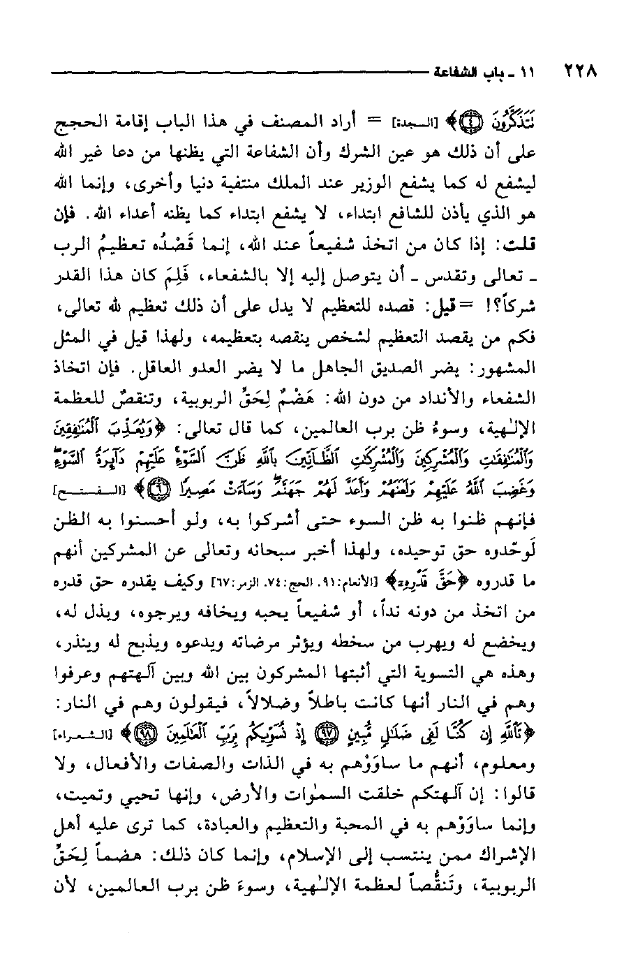 تَتَذَكَّرُونَ} 1. أراد المصنف في هذا الباب إقامة الحجج على أن ذلك هو عين الشرك وأن الشفاعة التي يظنها مَنْ دعا غير الله ليشفع له كما يشفع الوزير عند الملك منتفية دنيا وأخرى، وإنما الله هو الذي يأذن للشافع ابتداء، لا يشفع ابتداء كما يظنه أعداء الله. فإن قلت: إذا كان من اتخذ شفيعا عند الله، إنما قصده تعظيم الرب تعالى وتقدس أن يتوصل إليه إلا بالشفعاء، فلم كان هذا القدر شركًا؟!