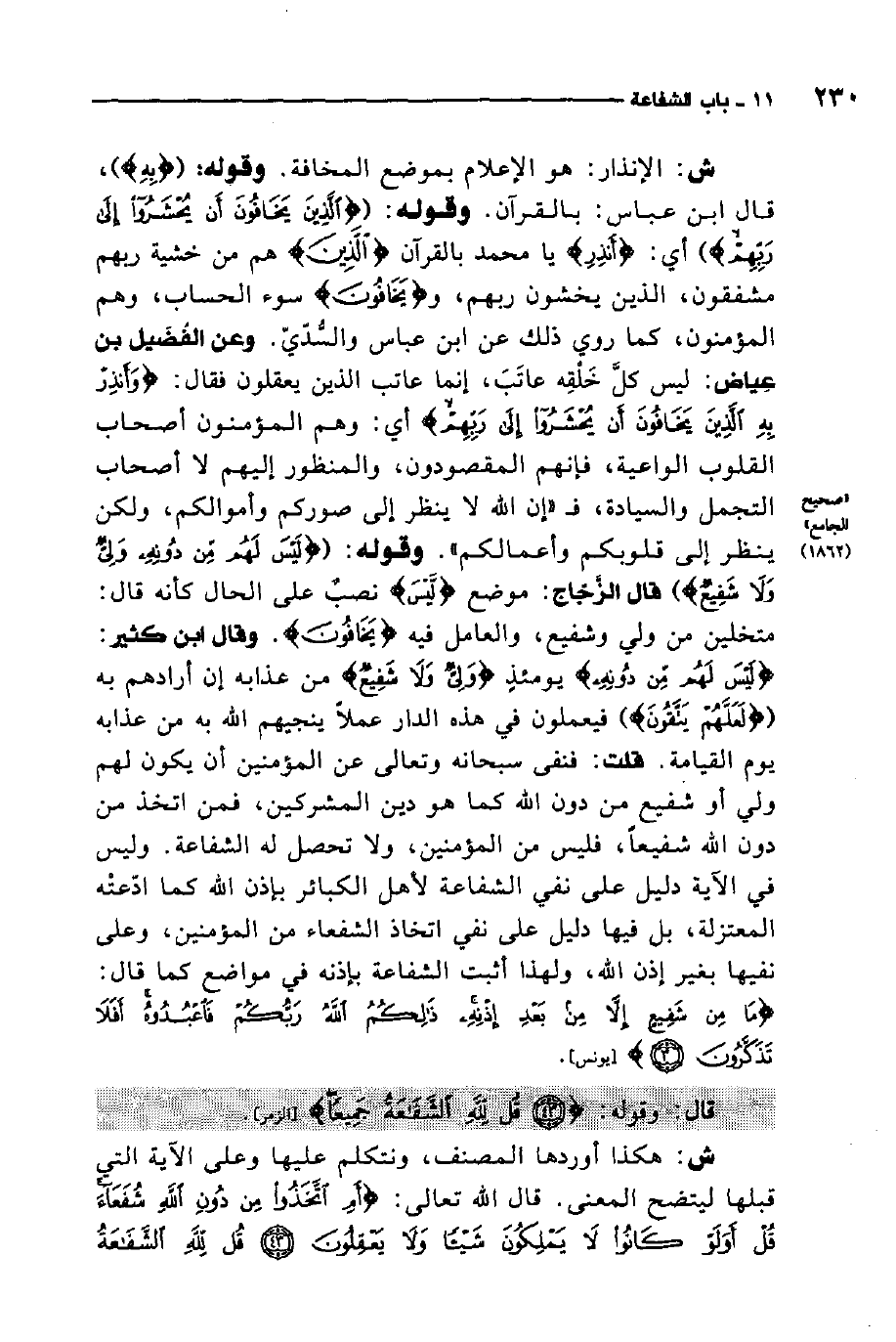ش: هكذا أوردها المصنف، ونتكلم عليها وعلى الآية التي قبلها ليتضح المعنى. قال الله تعالى: {أَمِ اتَّخَذُوا مِنْ دُونِ اللَّهِ شُفَعَاءَ قُلْ أَوَلَوْ كَانُوا لا يَمْلِكُونَ شَيْئاً وَلا يَعْقِلُونَ قُلْ لِلَّهِ الشَّفَاعَةُ