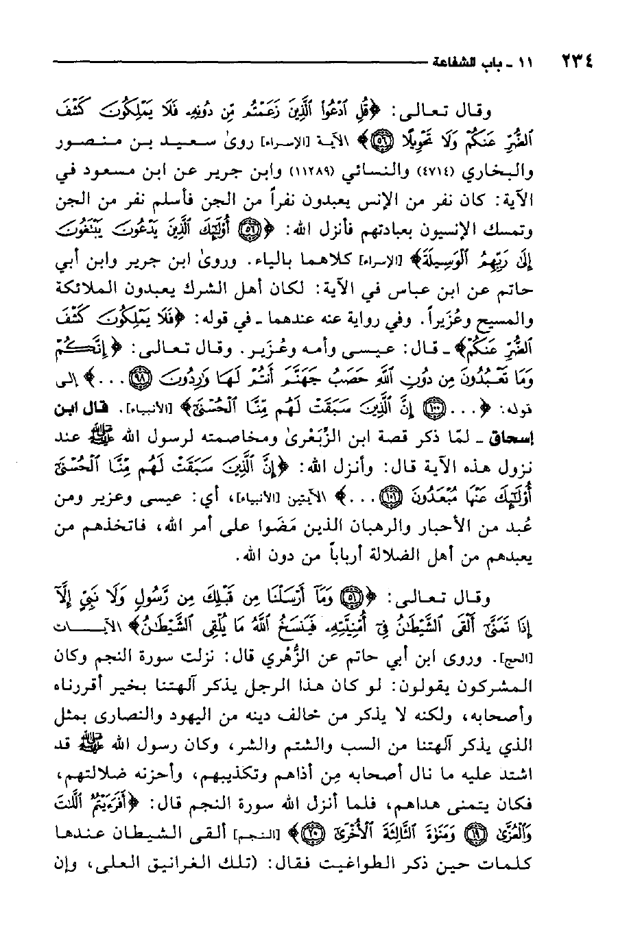 وروى ابن جرير وابن أبي حاتم عن "ابن عباس في الآية لما كان أهل الشرك يعبدون الملائكة والمسيح وعزيرًا. وفي رواية عنه عندهما في قوله: {فَلا يَمْلِكُونَ كَشْفَ الضُّرِّ عَنْكُمْ} قال عيسى وأمه وعزير. وقال تعالى: {إِنَّكُمْ وَمَا تَعْبُدُونَ مِنْ دُونِ اللَّهِ حَصَبُ جَهَنَّمَ أَنْتُمْ لَهَا وَارِدُونَ} 2 إلى قوله: {إِنَّ الَّذِينَ سَبَقَتْ لَهُمْ مِنَّا الْحُسْنَى} 3 قال ابن إسحاق: لما ذكر قصة ابن الزبعري ومخاصمته لرسول الله صلى الله عليه وسلم عند نزول هذه الآية قال: وأنزل الله: {إِنَّ الَّذِينَ سَبَقَتْ لَهُمْ مِنَّا الْحُسْنَى أُولَئِكَ عَنْهَا مُبْعَدُونَ ... } 4 الآيتين، أي: عيسى وعزير ومن عبد من الأحبار والرهبان الذين مضوا على أمر الله، فاتخذهم من يعبدهم من أهل الضلالة أربابًا من دون الله. وقال تعالى: {وَمَا أَرْسَلْنَا مِنْ قَبْلِكَ مِنْ رَسُولٍ وَلا نَبِيٍّ إِلاَّ إِذَا تَمَنَّى أَلْقَى الشَّيْطَانُ فِي أُمْنِيَّتِهِ فَيَنْسَخُ اللَّهُ مَا يُلْقِي الشَّيْطَانُ} 5 الآيات.