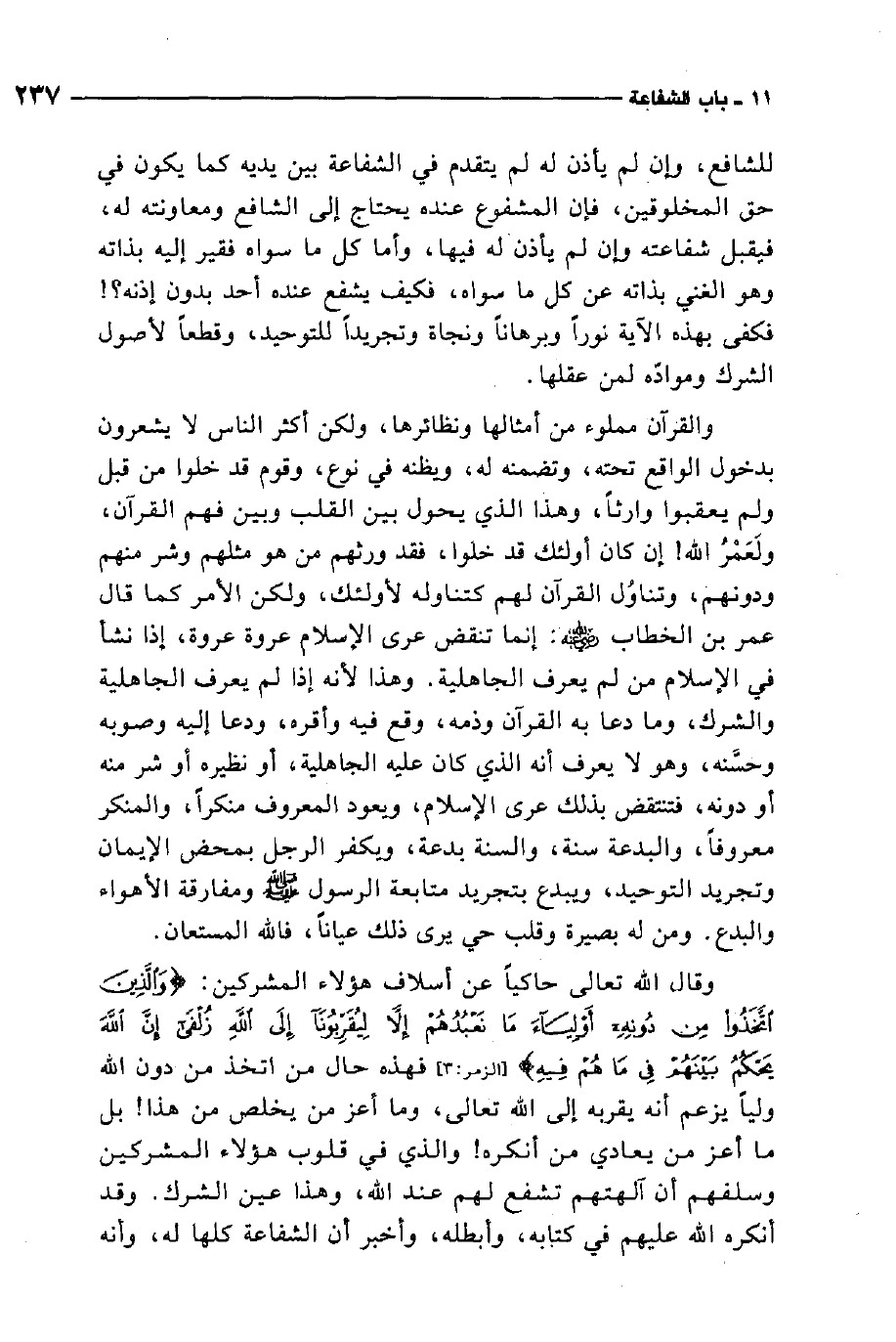 وقال الله تعالى حاكيًا عن أسلاف هؤلاء المشركين: {وَالَّذِينَ اتَّخَذُوا مِنْ دُونِهِ أَوْلِيَاءَ مَا نَعْبُدُهُمْ إِلاَّ لِيُقَرِّبُونَا إِلَى اللَّهِ زُلْفَى إِنَّ اللَّهَ يَحْكُمُ بَيْنَهُمْ فِي مَا هُمْ فِيهِ يَخْتَلِفُونَ} 1. فهذه حال من اتخذ من دون الله وليًا يزعم أنه يقربه إلى الله تعالى، وما أعز من يخلص من هذا بل ما أعز من يعادي من أنكره. والذي في قلوب هؤلاء المشركين وسلفهم أن آلهتهم تشفع لهم عند الله، وهذا عين الشرك، وقد أنكره الله عليهم في كتابه، وأبطله، وأخبر أن الشفاعة كلها له، وأنه