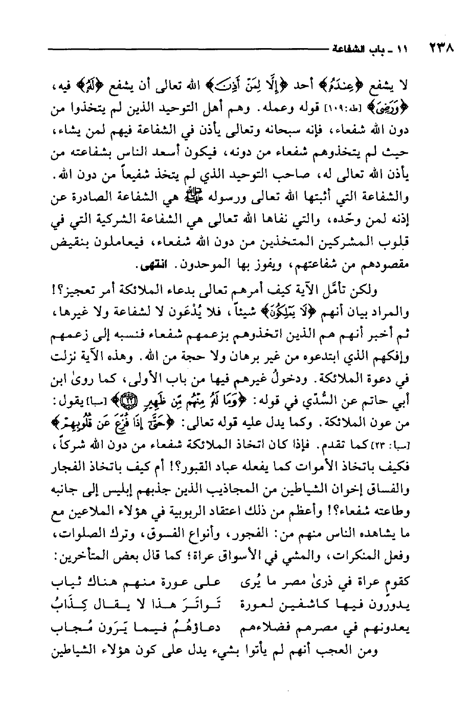 فإذا كان اتخاذ الملائكة شفعاء من دون الله شركًا، فكيف باتخاذ الأموات كما يفعله عباد القبور؟ أم كيف باتخاذ الفجار والفساق إخوان الشياطين من المجاذيب الذين جذبهم إبليس إلى جانبه وطاعته شفعاء؟ وأعظم من ذلك اعتقاد الربوبية في هؤلاء الملاعين مع ما يشاهده الناس منهم من الفجور، وأنواع الفسوق، وترك الصلوات، وفعل المنكرات، والمشي في الأسواق عراة.