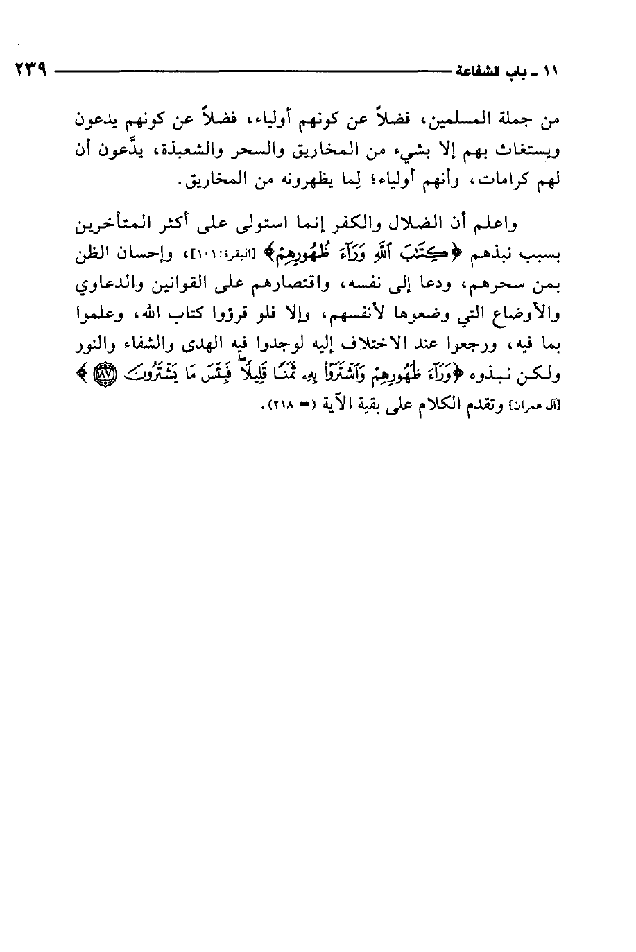 وأعلم أن الضلال والكفر إنما استولى على أكثر المتأخرين بسبب نبذهم كتاب الله وراء ظهورهم، وإحسان الظن بمن سحرهم، ودعا إلى نفسه، واقتصارهم على القوانين والدعاوي والأوضاع التي وضعوها لأنفسهم، وإلا فلو قرؤوا كتاب الله، وعلموا بما فيه، ورجعوا عند الاختلاف إليه لوجدوا فيه الهدى والشفاء والنور، ولكن نبذوه وراء ظهورهم واشتروا به ثمنًا قليلا فبئس ما يشترون وتقدم الكلام على بقية الآية.