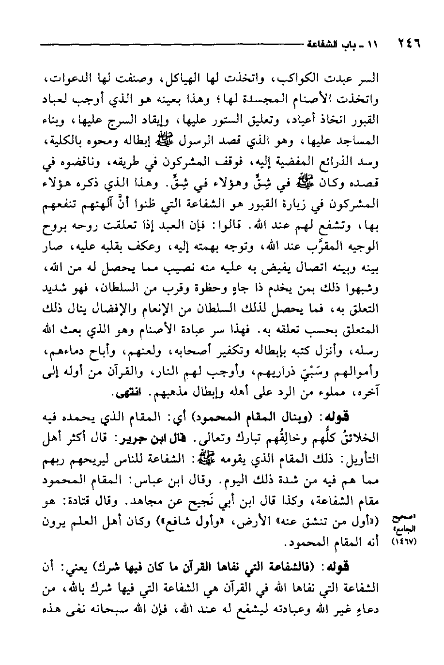 وقال "ابن عباس: المقام المحمود مقام الشفاعة". وكذا قال ابن أبي نجيح عن مجاهد. وقال قتادة: هو أول من تنشق عنه الأرض، وأول شافع، وكان أهل العلم يرون أنه المقام المحمود.