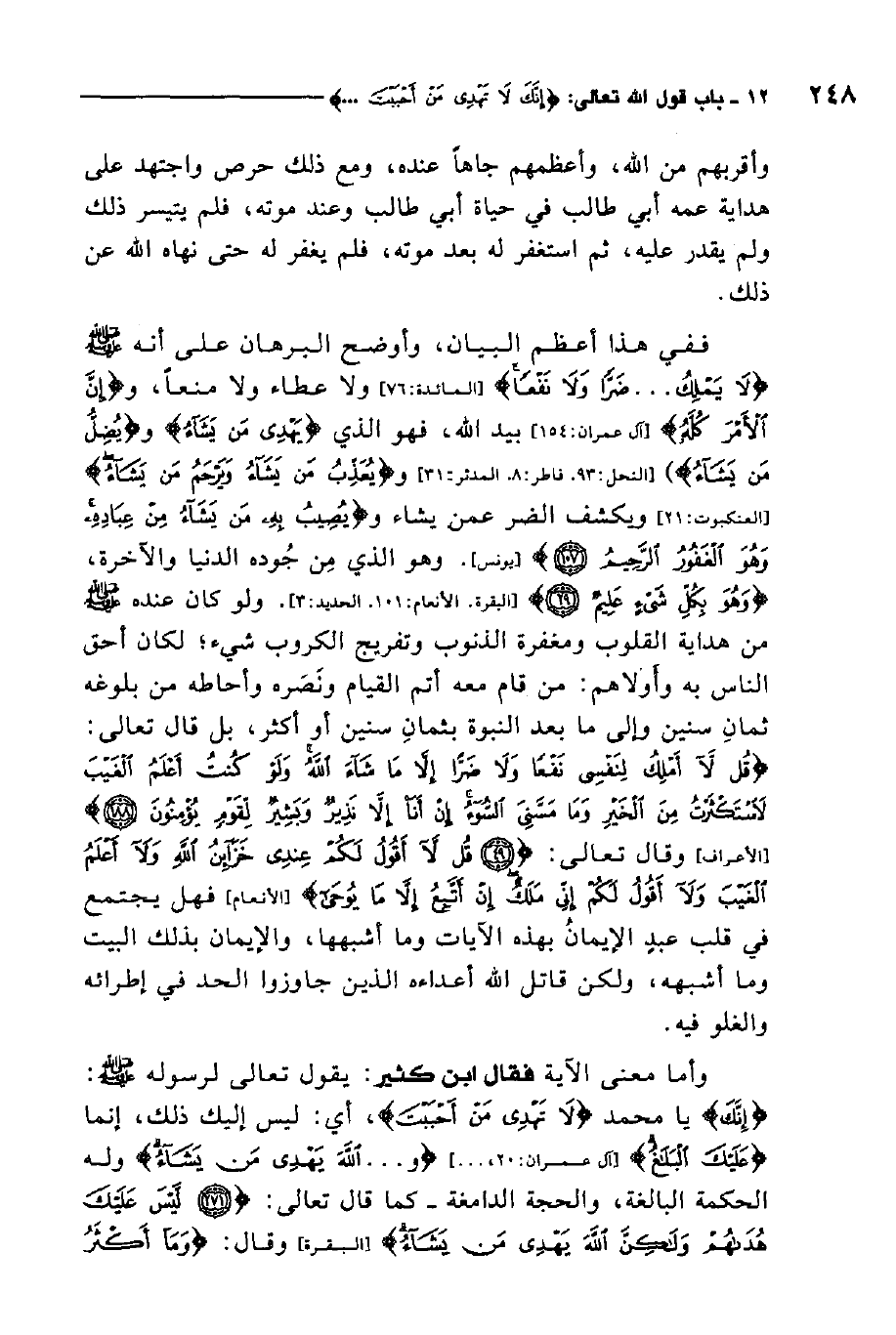 ففي هذا أعظم البيان، وأوضح البرهان على أنه صلى الله عليه وسلم لا يملك ضرًا ولا نفعًا، ولا عطاء ولا منعًا، وأن الأمر كله بيد الله، فهو الذي يهدي من يشاء، ويضل من يشاء، ويعذب من يشاء، ويرحم من يشاء، ويكشف الضر عمن يشاء، ويصيب به من يشاء من عباده وهو الغفور الرحيم وهو الذي من جوده الدنيا والآخرة، وهو بكل شيء عليم. ولو كان عنده صلى الله عليه وسلم من هداية القلوب ومغفرة الذنوب وتفريج الكروب شيء ; لكان أحق الناس به، وأولاهم من قام معه أتم القيام ونصره، وأحاطه من بلوغه ثمان سنين إلى ما بعد النبوة بثمان سنين أو أكثر، بل قال تعالى: {قُلْ لا أَمْلِكُ لِنَفْسِي نَفْعاً وَلا ضَرّاً إِلاَّ مَا شَاءَ اللَّهُ وَلَوْ كُنْتُ أَعْلَمُ الْغَيْبَ لاسْتَكْثَرْتُ مِنَ الْخَيْرِ وَمَا مَسَّنِيَ السُّوءُ إِنْ أَنَا إِلاَّ نَذِيرٌ وَبَشِيرٌ لِقَوْمٍ يُؤْمِنُونَ} 1. وقال تعالى: {قُلْ لا أَقُولُ لَكُمْ عِنْدِي خَزَائِنُ اللَّهِ وَلا أَعْلَمُ الْغَيْبَ وَلا أَقُولُ لَكُمْ إِنِّي مَلَكٌ إِنْ أَتَّبِعُ إِلاَّ مَا يُوحَى} 2. فهل يجتمع في قلب عبد الإيمان بهذه الآيات وما أشبهها، والإيمان بذلك البيت وما أشبهه، ولكن قاتل الله أعداءه الذين جاوزوا الحد في إطرائه والغلو فيه.