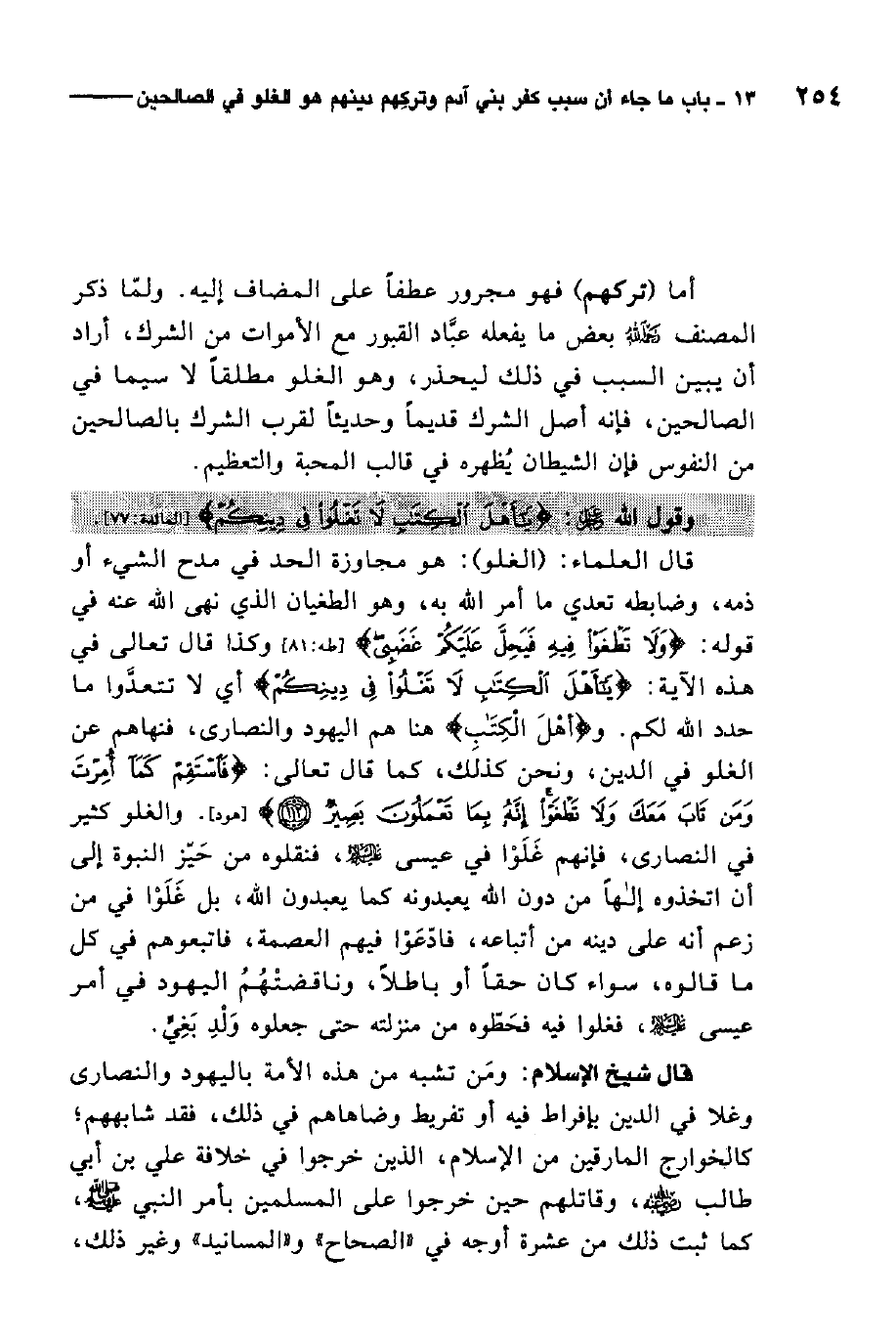 وقول الله عز وجل: {قُلْ يَا أَهْلَ الْكِتَابِ لا تَغْلُوا فِي دِينِكُمْ} 1. قال العلماء: الغلو هو مجاورة الحد في مدح الشيء أو ذمه، وضابطه تعدي ما أمر الله به وهو الطغيان الذي نهى الله عنه في قوله: {وَلا تَطْغَوْا فِيهِ فَيَحِلَّ عَلَيْكُمْ غَضَبِي} 2. وكذا قال تعالى في هذه الآية: {قُلْ يَا أَهْلَ الْكِتَابِ لا تَغْلُوا فِي دِينِكُمْ} 3. أي: لا تتعدوا ما حدد الله لكم. وأهل الكتاب هنا هم اليهود والنصارى، فنهاهم عن الغلو في الدين ونحن كذلك، كما قال تعالى: {فَاسْتَقِمْ كَمَا أُمِرْتَ وَمَنْ تَابَ مَعَكَ وَلا تَطْغَوْا إِنَّهُ بِمَا تَعْمَلُونَ بَصِيرٌ} 4.