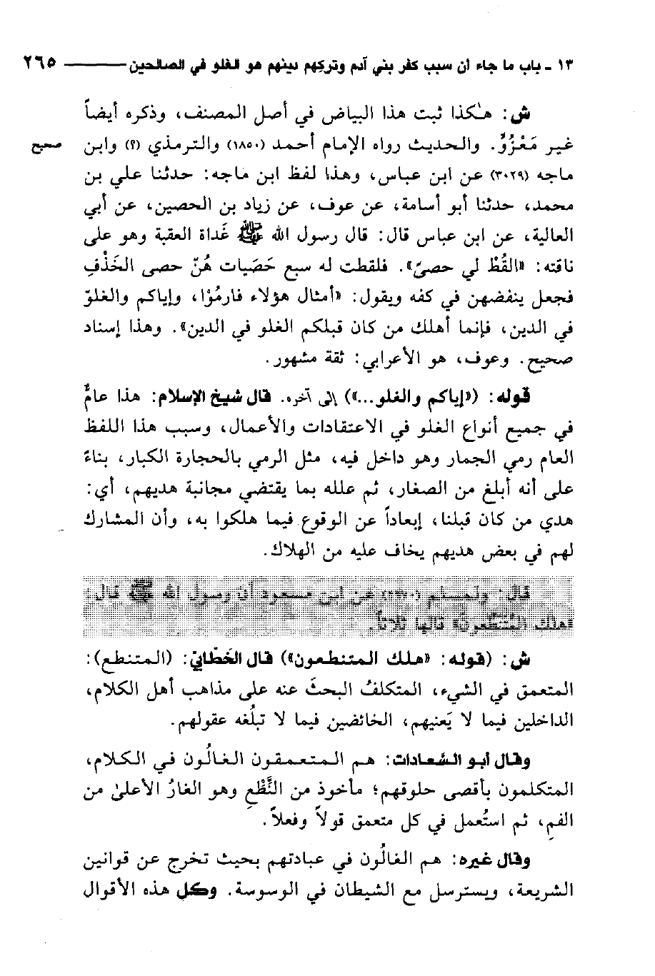 ش: هكذا ثبت هذا البياض في أصل المصنف، وذكره أيضًا غير معزو. والحديث رواه الإمام أحمد والترمذي وابن ماجة عن ابن عباس، وهذا لفظ ابن ماجة: حدثنا علي بن محمد حدثنا أبو أسامة عن عوف عن زياد بن الحصين عن أبي العالية عن ابن عباس قال: قال رسول الله صلى الله عليه وسلم: "غداة العقبة وهو على ناقته: القط لي حصى. فلقطت له سبع حصيات هن حصى الحذف فجعل ينفضهن في كفه ويقول: أمثال هؤلاء فارموا، وإياكم والغلو في الدين، فإنما أهلك من كان قبلكم الغلو في الدين" 1. وهذا إسناد صحيح. وعوف، هو الأعرابي ثقة مشهور.