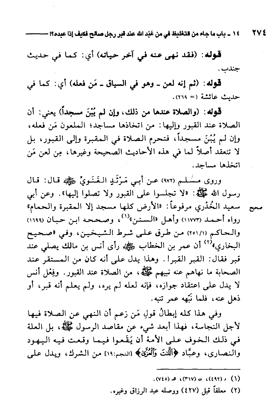 وروى مسلم عن أبي مرثد الغنوي رضي الله عنه قال: قال رسول الله صلى الله عليه وسلم: "لا تجلسوا على القبور ولا تصلوا إليها" 1 وعن أبي سعيد الخدري مرفوعًا: "الأرض كلها مسجد إلا المقبرة والحمام" 2. رواه أحمد وأهل السنن، وصححه ابن حبان والحاكم من طرق على شرط الشيخين، وفي "صحيح البخاري" أن: "عمر بن الخطاب رضي الله عنه رأى أنس بن مالك يصلي عند قبر فقال: القبر القبر". وهذا يدل على أنه كان من المستقر عند الصحابة ما نهاهم عنه نبيهم صلى الله عليه وسلم من الصلاة عند القبور. وفعل أنس لا يدل على اعتقاد جوازه، فإنه لعله لم يره، ولم يعلم أنه قبر أو ذهل عنه، فلما نبهه عمر تنبه.