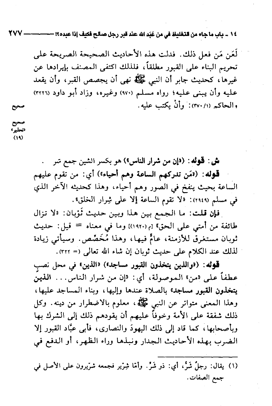 لعن من فعل ذلك. فدلت هذه الأحاديث الصحيحة الصريحة على تحريم البناء على القبور مطلقًا، فلذلك اكتفى المصنف بإيرادها عن غيرها، كحديث جابر أن النبي صلى الله عليه وسلم نهى أن يجصص القبر، وأن يقعد عليه وأن يبنى عليه. رواه مسلم وغيره وزاد أبو داود والحاكم: وأن يكتب عليه.