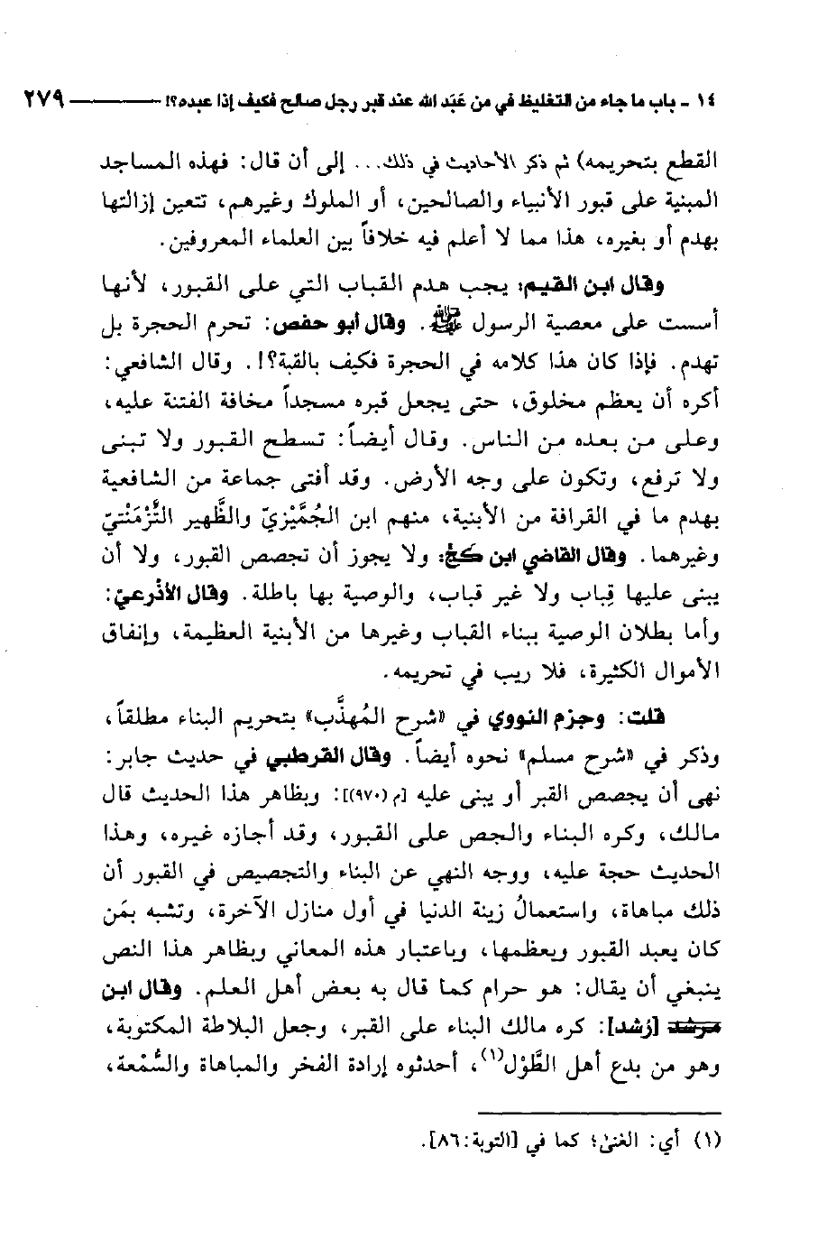 وقال ابن القيم: "يجب هدم القباب التي على القبور، لأنها أسست على معصية الرسول صلى الله عليه وسلم". وقال أبو حفص: "تحرم الحجرة بل تهدم. فإذا كان هذا كلامه في الحجرة فكيف بالقبة". وقال الشافعي: "أكره أن يعظم مخلوق، حتى يجعل قبره مسجدًا مخافة الفتنة عليه، وعلى من بعده من الناس". وقال أيضًا: "تسطح القبور ولا تبنى ولا ترفع، وتكون على وجه الأرض. وقد أفتى جماعة من الشافعية بهدم ما في القرافة من الأبنية، منهم ابن الجميزي والظهير التزمنْتِي وغيرهما". وقال القاضي ابن كج: "ولا يجوز أن تجصص القبور، ولا أن يبنى عليها قباب ولا غير قباب، والوصية بها باطلة". وقال الأذرعي: "وأما بطلان الوصية ببناء القباب وغيرها من الأبنية العظيمة، وإنفاق الأموال الكثيرة، فلا ريب في تحريمه".
