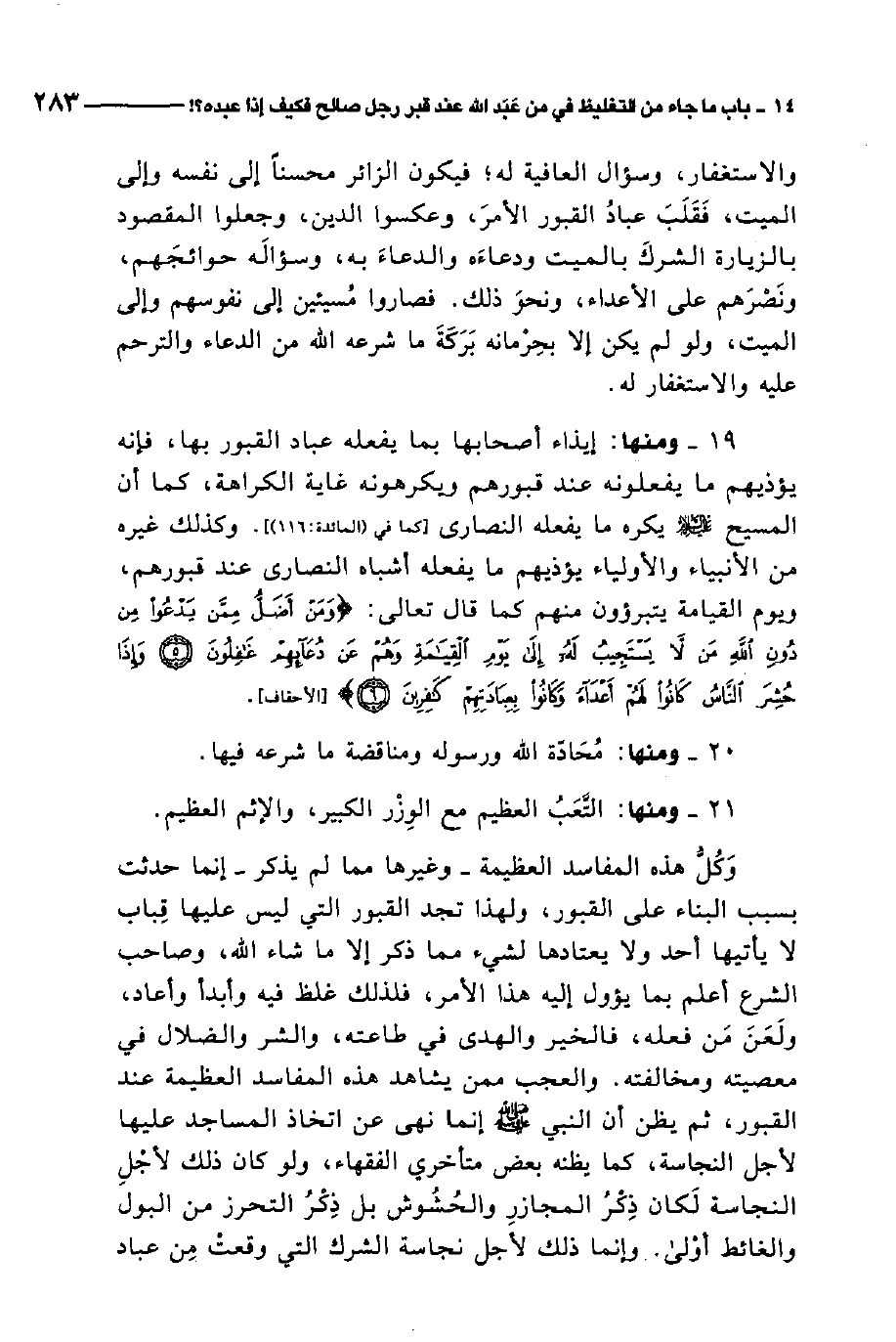 ومنها: التعب العظيم مع الوزر الكبير، والإثم العظيم، وكل هذه المفاسد العظيمة وغيرها مما لم يذكر، إنما حدثت بسبب البناء على القبور، ولهذا تجد القبور التي ليس عليها قباب لا يأتيها أحد ولا يعتادها لشيء مما ذكر إلا ما شاء الله، وصاحب الشرع أعلم بما يؤول إليه هذا الأمر، فلذلك غلظ فيه وأبدأ وأعاد، ولعن من فعله، فالخير والهدى في طاعته، والشر والضلال في معصيته ومخالفته. والعجب ممن يشاهد هذه المفاسد العظيمة عند القبور، ثم يظن أن النبي صلى الله عليه وسلم إنما نهى عن اتخاذ المساجد عليها لأجل النجاسة، كما يظنه بعض متأخري الفقهاء، ولو كان ذلك لأجل النجاسة لكان ذكر المجازر والحشوش بل ذكر التحرز من البول والغائط أولى. وإنما ذلك لأجل نجاسة الشرك التي وقعت من عباد