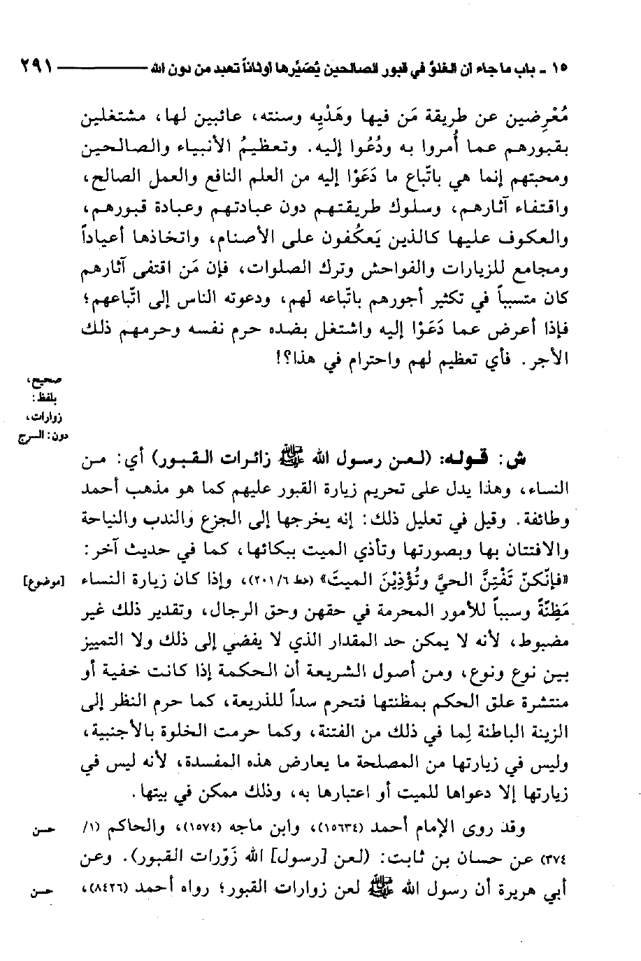 قال: وعن ابن عباس قال: "لعن رسول الله صلى الله عليه وسلم زائرات القبور والمتخذين عليها المساجد والسرج" 1. رواه أهل السنن.