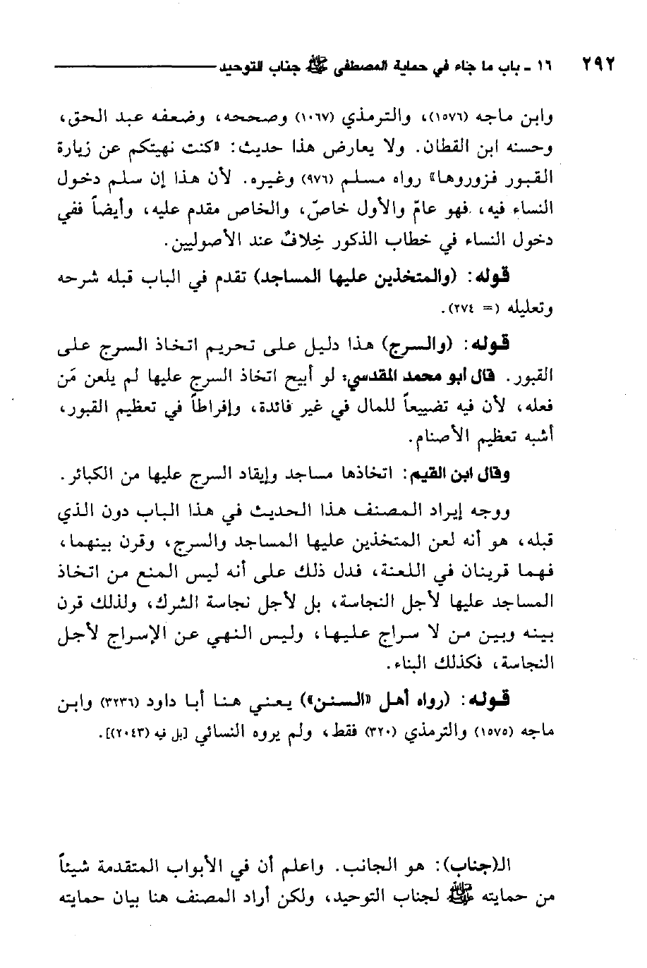 ووجه إيراد المصنف هذا الحديث في هذا الباب دون الذي قبله، هو أنه لعن المتخذين عليها المساجد والسرج، وقرن بينهما، فهما قرينان في اللعنة، فدل ذلك على أنه ليس المنع من اتخاذ المساجد عليها لأجل النجاسة، بل لأجل نجاسة الشرك، ولذلك قرن بينه وبين من لا سراج عليها، وليس النهي عن الإسراج لأجل النجاسة، فكذلك البناء.