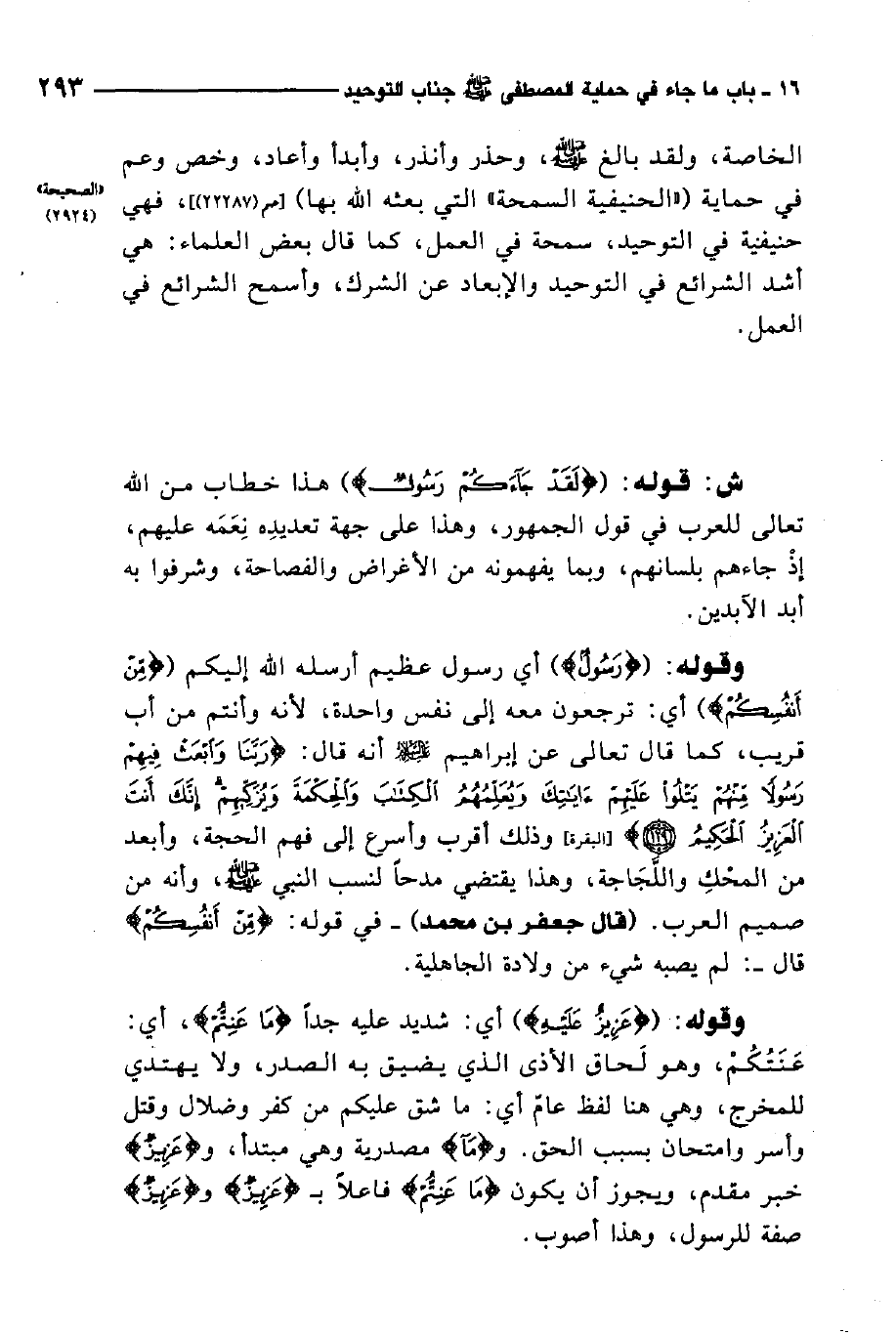 قال: وقوله تعالى: {لَقَدْ جَاءَكُمْ رَسُولٌ مِنْ أَنْفُسِكُمْ عَزِيزٌ عَلَيْهِ مَا عَنِتُّمْ ... } 1.