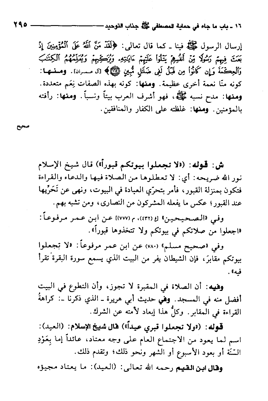 ش قوله: "لا تجعلوا بيوتكم قبورا" 3. قال شيخ الإسلام نور الله ضريحه: أي: لا تعطّلوها من الصلاة فيها والدعاء والقراءة فتكون بمنْزلة القبور، فأمر بتحري العبادة في البيوت، ونهى عن تحريها عند القبور، عكس ما يفعله المشركون من النصارى، ومن تشبه بهم.