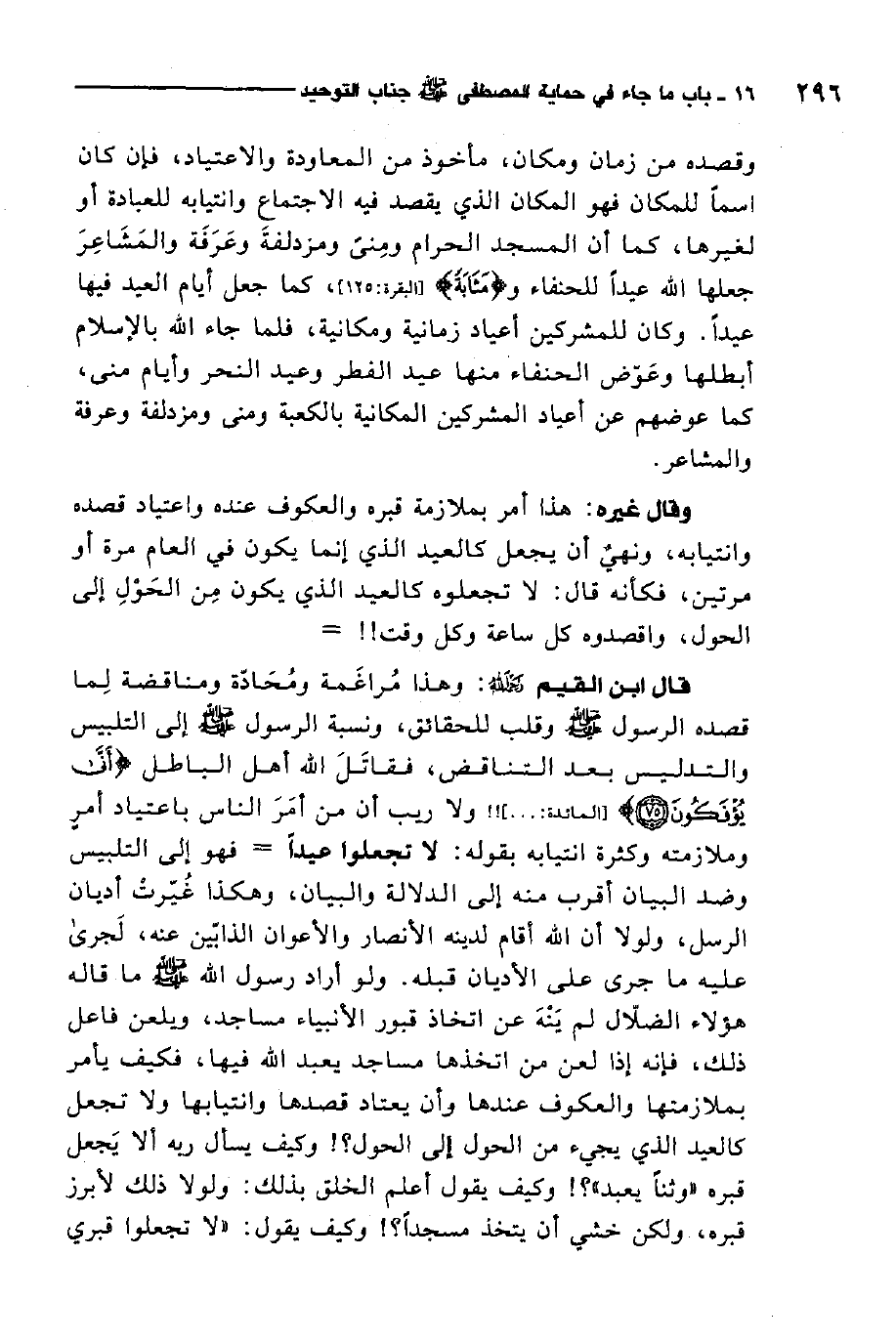 قال ابن القيم رحمه الله: "وهذا مراغمة ومحادة ومناقضة لما قصده الرسول صلى الله عليه وسلم وقلب للحقائق، ونسبة الرسول صلى الله عليه وسلم إلى التلبيس والتدليس بعد التناقض، فقاتل الله أهل الباطل أنَّى يؤفكون. ولا ريب أن من أمر الناس باعتياد أمر وملازمته وكثرة انتيابه بقوله: لا تجعلوا عيدًا، فهو إلى التلبيس وضد البيان أقرب منه إلى الدلالة والبيان، وهكذا غُيِّرَت أديان الرسل، ولولا أن الله أقام لدينه الأنصار والأعوان الذابّين عنه، لجرى عليه، ما جرى على الأديان قبله. ولو أراد رسول الله صلى الله عليه وسلم ما قاله هؤلاء الضلال لم ينه عن اتخاذ قبور الأنبياء مساجد، ويلعن فاعل ذلك، فإنه إذا لعن من اتخذها مساجد يعبد الله فيها، فكيف يأمر بملازمتها والعكوف عندها وأن يعتاد قصدها وانتيابها؟! ولا تجعل كالعيد الذي يجيء من الحول إلى الحول وكيف يسأل ربه أن لا يجعل قبره وثنًا يعبد، وكيف يقول أعلم الخلق بذلك: ولولا ذلك لأبرز قبره، ولكن خشي أن يتخذ مسجدًا، وكيف يقول: "لا تجعلوا قبري