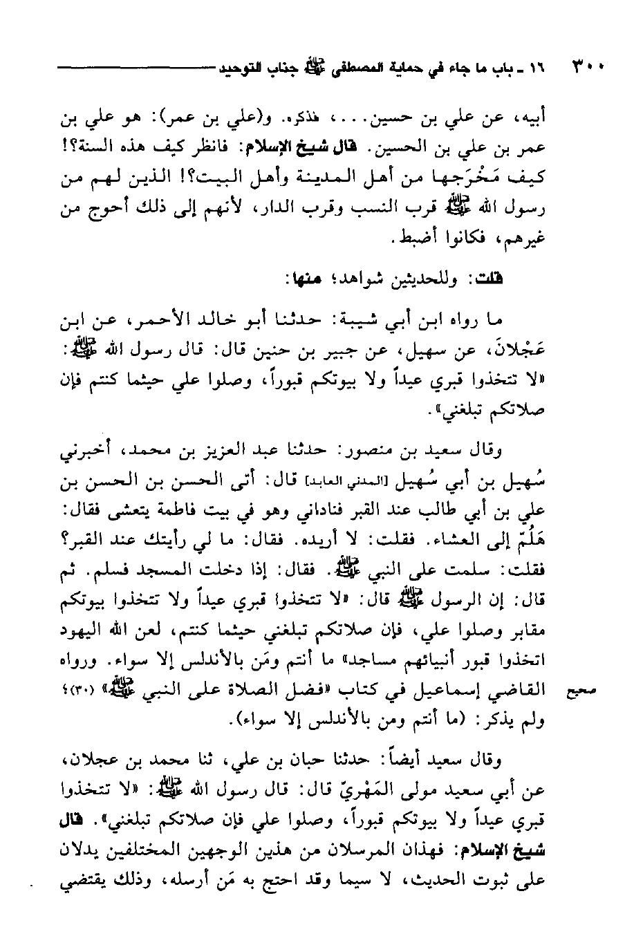 وقال سعيد: أيضًا حدثنا حبان ابن علي ثنا محمد بن عجلان عن أبي سعيد مولى المهري قال: قال رسول الله صلى الله عليه وسلم: "لا تتخذوا قبري عيدًا ولا بيوتكم قبورًا، وصلوا علي فإن صلاتكم تبلغني" 4. قال شيخ الإسلام: "فهذان المرسلان من هذين الوجهين المختلفين يدلان على ثبوت الحديث لا سيما وقد احتج به من أرسله، وذلك يقتضي