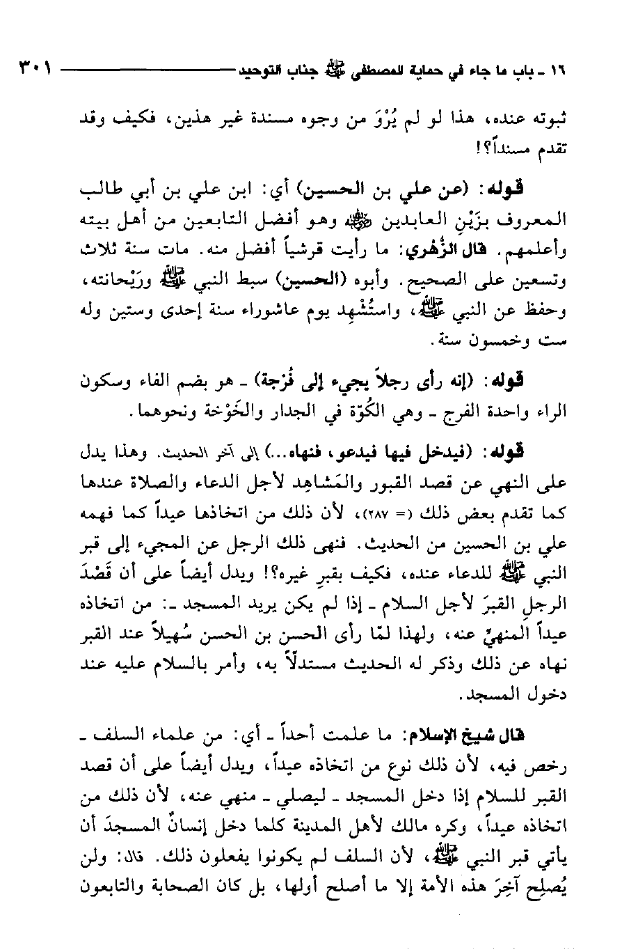قوله: (فيدخل فيها فيدعو فنهاه إلى آخر الحديث) . وهذا يدل على النهي عن قصد القبور والمشاهد لأجل الدعاء والصلاة عندها كما تقدم بعض ذلك، لأن ذلك من اتخاذها عيدًا كما فهمه علي بن الحسين من الحديث. فنهى ذلك الرجل عن المجيء إلى قبر النبي صلى الله عليه وسلم للدعاء عنده، فكيف بقبر غيره؟!