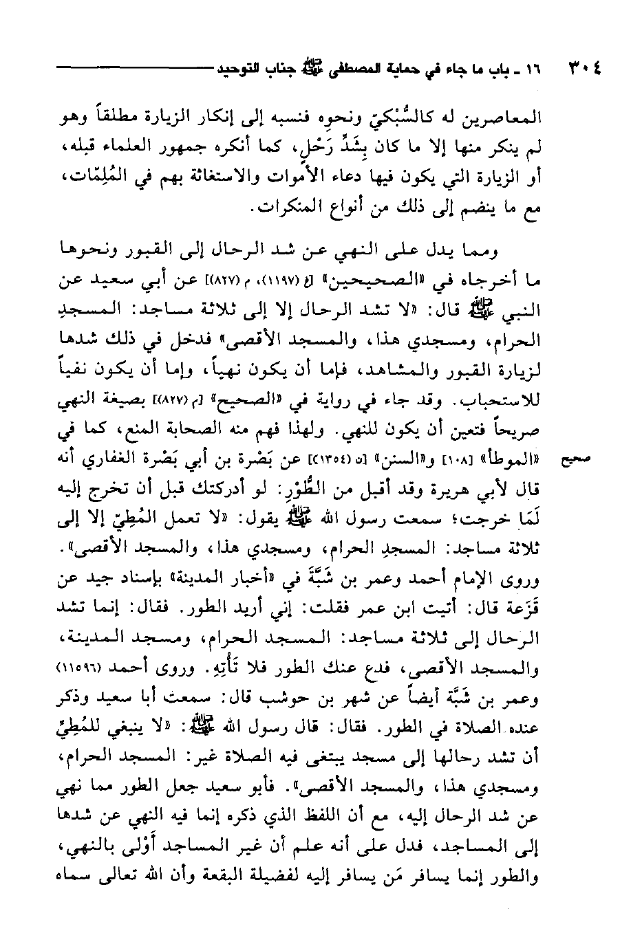 ومما يدل على النهي عن شد الرحال إلى القبور ونحوها ما أخرجاه في "الصحيحين" عن أبي سعيد عن النبي صلى الله عليه وسلم قال: "لا تشد الرحال إلا إلى ثلاثة مساجد: المسجد الحرام، ومسجدي هذا، والمسجد الأقصى" 1. فدخل في ذلك شدها لزيارة القبور والمشاهد فإما أن يكون نهيًا، وإما أن يكون نفيًا للاستحباب.