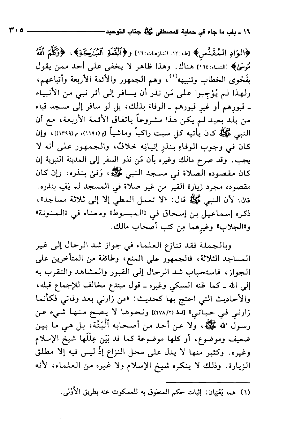 وهذا ظاهر لا يخفى على أحد ممن يقول بفحوى الخطاب وتنبيهه، وهم الجمهور والأئمة الأربعة وأتباعهم ولهذا لم يوجبوا على من نذر أن يسافر إلى أثر نبي من الأنبياء قبورهم أو غير قبورهم الوفاء بذلك، بل لو سافر إلى مسجد قباء من بلد بعيد لم يكن هذا مشروعًا باتفاق الأئمة الأربعة، مع أن النبي صلى الله عليه وسلم كان يأتيه كل سبت راكبًا وماشيًا، وإن كان في وجوب الوفاء بنذر إتيانه خلاف والجمهور على أنه لا يجب.