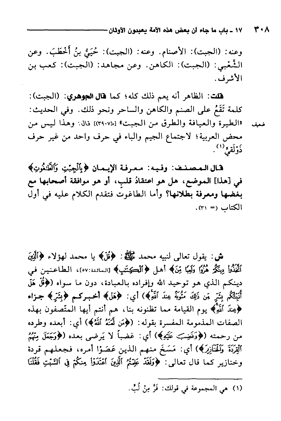 قال المصنف: وفيه معرفة الإيمان بالجبت والطاغوت في [هذا] الموضع، هل هو اعتقاد قلب، أو هو موافقة أصحابها مع بغضها ومعرفة بطلانها؟ وأما الطاغوت فتقدم الكلام عليه في أول الكتاب.