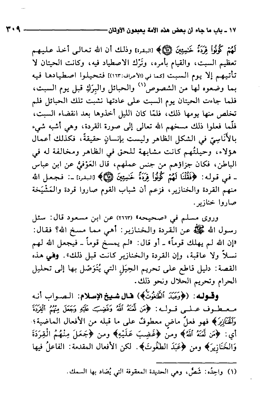 لَهُمْ كُونُوا قِرَدَةً خَاسِئِينَ} 1.وذلك أن الله تعالى أخذ عليهم تعظيم السبت، والقيام بأمره، وترك الاصطياد فيه، وكانت الحيتان لا تأتيهم إلا يوم السبت، فتحيلوا اصطيادها فيه بما وضعوه لها من الشصوص والحبائل والبرك قبل يوم السبت، فلما جاءت الحيتان يوم السبت على عادتها نشبت تلك الحبائل فلم تخلص منها يومها ذلك، فلما كان الليل أخذوها بعد انقضاء السبت، فلما فعلوا ذلك مسخهم الله تعالى إلى صورة القردة، وهي أشبه شيء بالأناسي في الشكل الظاهر وليست بإنسان حقيقة، فكذلك أعمال هؤلاء وحيلتهم كانت مشابهة للحق في الظاهر ومخالفة له في الباطن، فكان جزاؤهم من جنس عملهم.