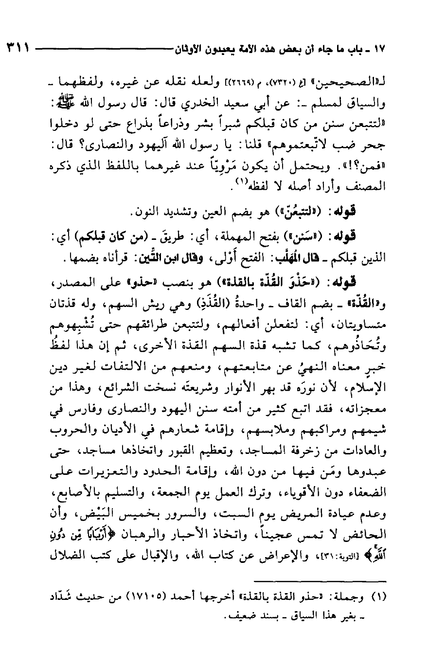قوله: (حذو القذة بالقذة) ، هو بنصب حذو على المصدر، والقذة - بضم القاف - واحدة القذذ وهي ريش السهم، وله قذتان متساويتان، أي: لتفعلن أفعالهم، ولتتبعن طرائقهم حتى تشبهوهم وتحاذوهم، كما تشبه قذة السهم القذة الأخرى، ثم إن هذا لفظ خبر معناه النهي عن متابعتهم، ومنعهم من الالتفات لغير دين الإسلام، لأن نوره قد بهر الأنوار وشريعته نسخت الشرائع، وهذا من معجزاته، فقد اتبع كثير من أمته سنن اليهود والنصارى وفارس في شيمهم ومراكبهم وملابسهم، وإقامة شعارهم في الأديان والحروب والعادات من زخرفة المساجد، وتعظيم القبور واتخاذها مساجد، حتى عبدوها ومن فيها من دون الله، وإقامة الحدود والتعزيرات على الضعفاء دون الأقوياء، وترك العمل يوم الجمعة، والتسليم بالأصابع، وعدم عيادة المريض يوم السبت، والسرور بخميس البيض، وأن الحائض لا تمس عجينًا، واتخاذ الأحبار والرهبان أَرْبَاباً مِنْ دُونِ الله، والإعراض عن كتاب الله، والإقبال على كتب الضلال