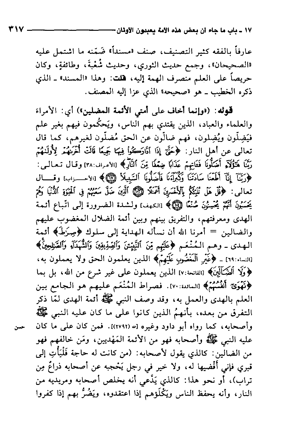 قوله: (وإنما أخاف على أمتي الأئمة المضلين) . أي: الأمراء والعلماء والعباد، الذين يقتدي بهم الناس، ويحكمون فيهم بغير علم فيضلون ويضلون، فهم ضالون عن الحق مضلون لغيرهم، كما قال تعالى عن أهل النار: {حَتَّى إِذَا ادَّارَكُوا فِيهَا جَمِيعاً قَالَتْ أُخْرَاهُمْ لأُولاهُمْ رَبَّنَا هَؤُلاءِ أَضَلُّونَا فَآتِهِمْ عَذَاباً ضِعْفاً مِنَ النَّارِ} 1. وقال تعالى: {رَبَّنَا إِنَّا أَطَعْنَا سَادَتَنَا وَكُبَرَاءَنَا فَأَضَلُّونَا السَّبِيلا} 2. وقال تعالى: {قُلْ هَلْ نُنَبِّئُكُمْ بِالأَخْسَرِينَ أَعْمَالاً الَّذِينَ ضَلَّ سَعْيُهُمْ فِي الْحَيَاةِ الدُّنْيَا وَهُمْ يَحْسَبُونَ أَنَّهُمْ يُحْسِنُونَ صُنْعاً} 3. ولشدة الضرورة إلى اتباع أئمة الهدى ومعرفتهم، والتفريق بينهم وبين أئمة الضلال المغضوب عليهم والضالين، أمرنا الله أن نسأله الهداية إلى سلوك صراط أئمة الهدى، وهم المنعم عليهم من النبيين والصديقين والشهداء والصالحين، غير المغضوب عليهم؛ الذين يعلمون الحق ولا يعملون به، ولا الضالين الذين يعملون على غير شرع من الله، بل بما تهوى أنفسهم.