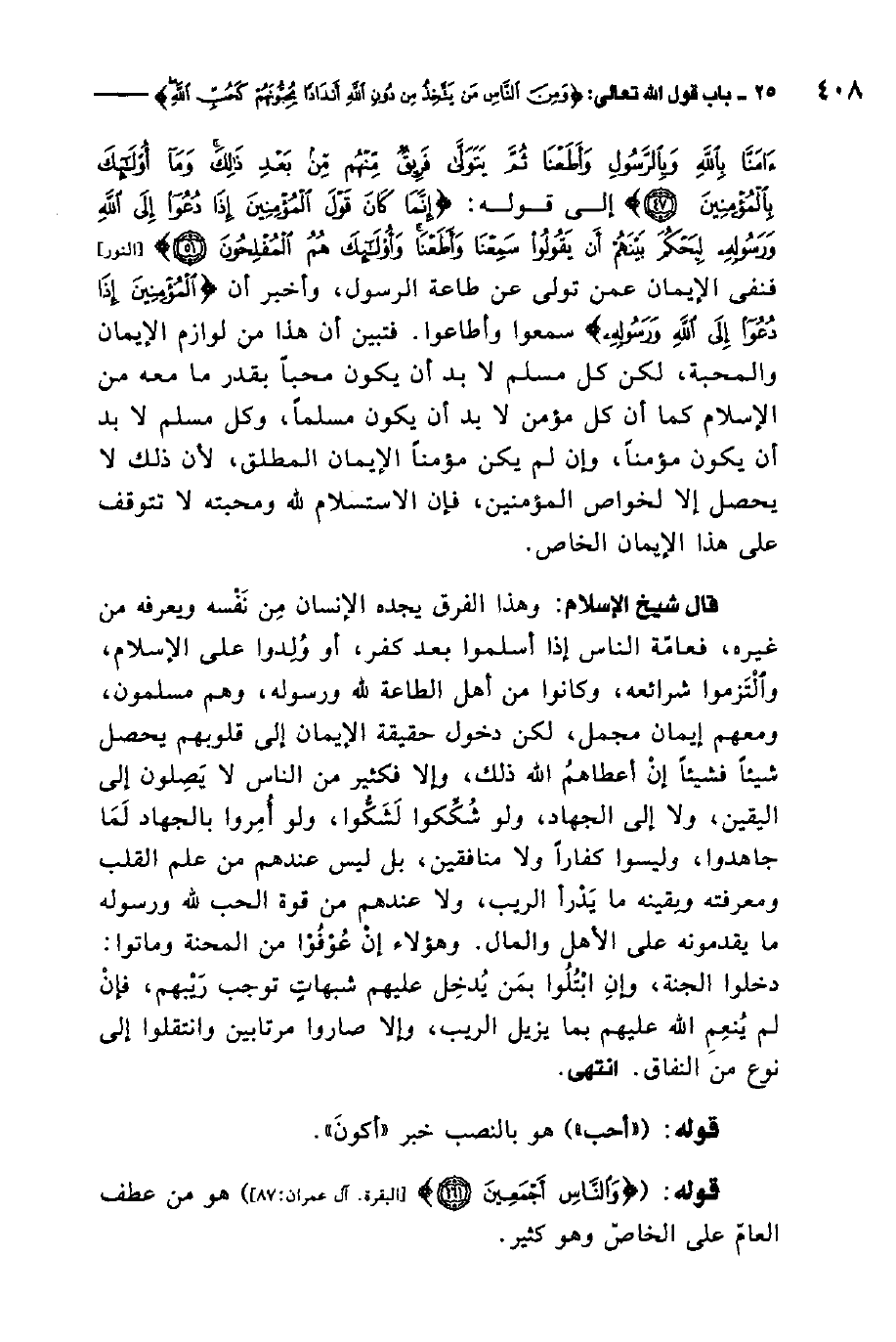 آمَنَّا بِاللَّهِ وَبِالرَّسُولِ وَأَطَعْنَا ثُمَّ يَتَوَلَّى فَرِيقٌ مِنْهُمْ مِنْ بَعْدِ ذَلِكَ وَمَا أُولَئِكَ بِالْمُؤْمِنِينَ} 1، إلى قوله: {إِنَّمَا كَانَ قَوْلَ الْمُؤْمِنِينَ إِذَا دُعُوا إِلَى اللَّهِ وَرَسُولِهِ لِيَحْكُمَ بَيْنَهُمْ أَنْ يَقُولُوا سَمِعْنَا وَأَطَعْنَا وَأُولَئِكَ هُمُ الْمُفْلِحُونَ} 2. فنفى الإيمان عمن تولى عن طاعة الرسول، وأخبر أن المؤمنين إذا دُعوا إلى الله ورسوله سمعوا وأطاعوا. فتبين أن هذا من لوازم الإيمان والمحبة، لكن كل مسلم لا بد أن يكون محبًّا بقدر ما معه من الإسلام كما أن كل مؤمن لا بد أن يكون مسلمًا، وكل مسلم لا بد أن يكون مؤمنًا، وإن لم يكن مؤمنًا الإيمان المطلق، لأن ذلك لا يحصل إلا لخواص المؤمنين، فإن الاستسلام لله ومحبته لا تتوقف على هذا الإيمان الخاص.