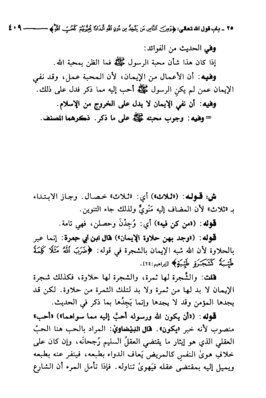 قوله: (وجد بهن حلاوة الإيمان) . قال ابن أبي جمرة: إنما عبر بالحلاوة لأن الله شبه الإيمان بالشجرة في قوله: {ضَرَبَ اللَّهُ مَثَلاً كَلِمَةً طَيِّبَةً كَشَجَرَةٍ طَيِّبَةٍ} 3.