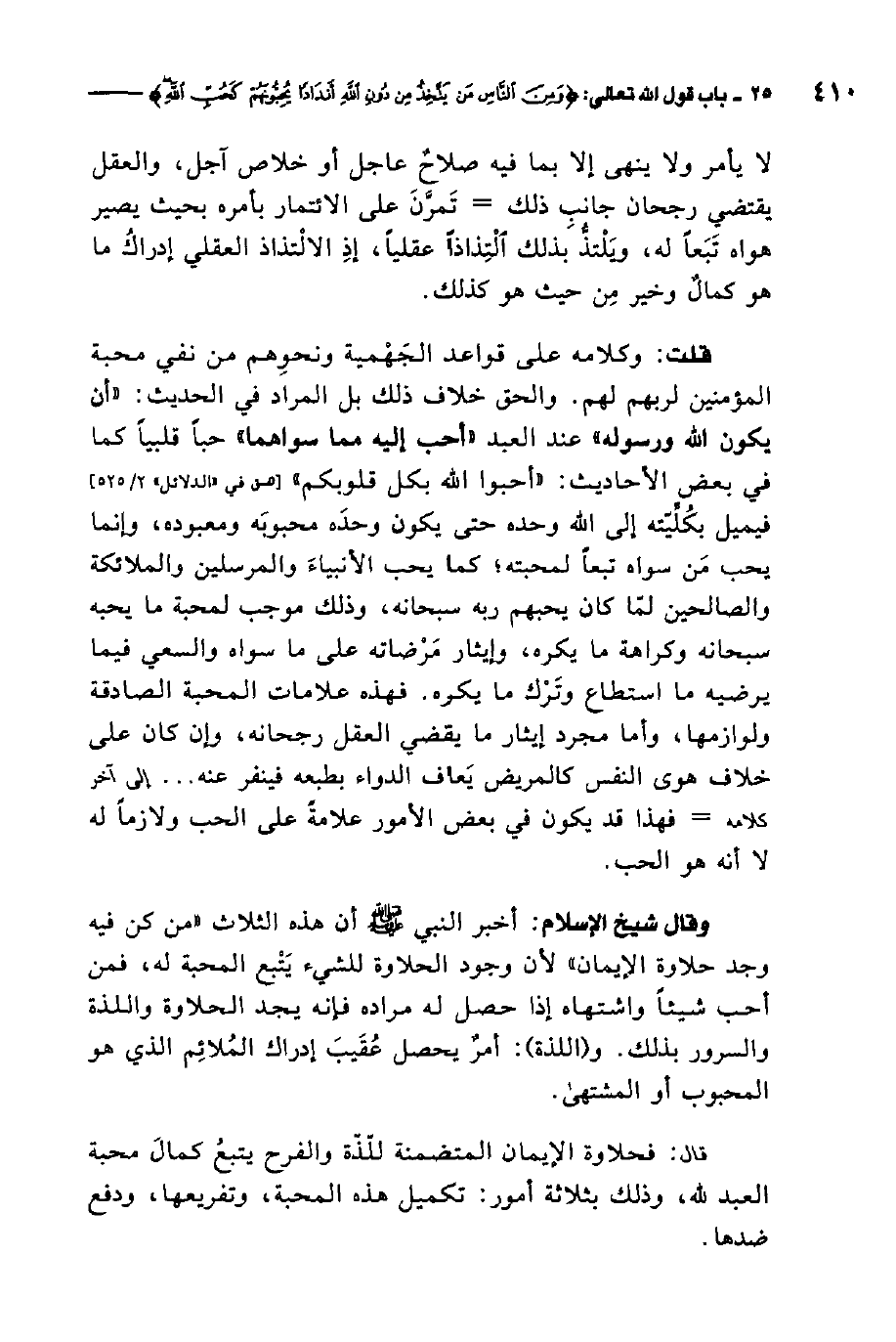 قلت: وكلامه على قواعد الجهمية ونحوهم من نفي محبة المؤمنين لربهم لهم. والحق خلاف ذلك بل المراد في الحديث أن يكون الله ورسوله عند العبد أحب إليه مما سواهما حبًّا قلبيًا كما في بعض الأحاديث: "أحبوا الله بكل قلوبكم". فيميل بكليته إلى الله وحده حتى يكون وحده محبوبه ومعبوده، وإنما يحب من سواه تبعًا لمحبته كما يحب الأنبياء والمرسلين والملائكة والصالحين لما كان يحبهم ربه سبحانه، وذلك موجب لمحبة ما يحبه سبحانه وكراهة ما يكره، وإيثار مرضاته على ما سواه والسعي فيما يرضيه ما استطاع وترك ما يكره. فهذه علامات المحبة الصادقة ولوازمها، وأما مجرد إيثار ما يقضي العقل رجحانه، وإن كان على خلاف هوى النفس كالمريض يعاف الدواء بطبعه فينفر عنه ... إلى آخر