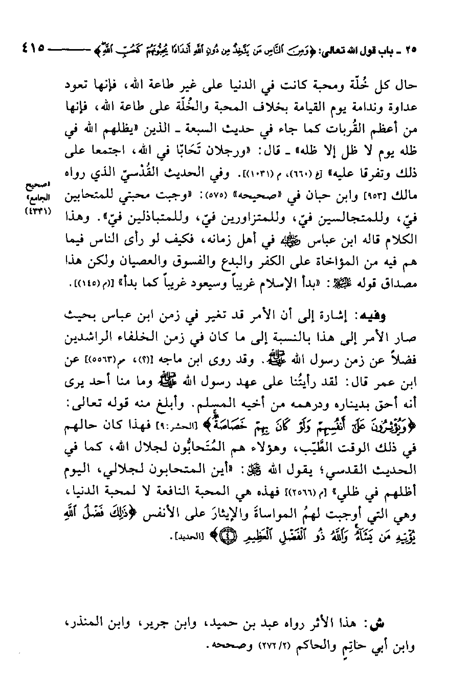وفيه إشارة إلى أن الأمر قد تغير في زمن ابن عباس بحيث صار الأمر إلى هذا بالنسبة إلى ما كان في زمن الخلفاء الراشدين فضلاً عن زمن رسول الله صلى الله عليه وسلم. وقد روى ابن ماجة عن "ابن عمر قال: لقد رأيتنا على عهد رسول الله صلى الله عليه وسلم وما منا أحد يرى أنه أحق بديناره ودرهمه من أخيه المسلم"4. وأبلغ منه قوله تعالى: {وَيُؤْثِرُونَ عَلَى أَنْفُسِهِمْ وَلَوْ كَانَ بِهِمْ خَصَاصَةٌ} 5. فهذا كان حالهم في ذلك الوقت الطيب، وهؤلاء هم المتحابون لجلال الله كما في الحديث القدسي يقول الله عزّ وجل: "أين المتحابون لجلالي، اليوم أظلهم في ظلي" 6 فهذه هي المحبة النافعة لا لمحبة الدنيا، وهي التي أوجبت لهم المواساة والإيثار على الأنفس. {ذَلِكَ فَضْلُ اللَّهِ يُؤْتِيهِ مَنْ يَشَاءُ وَاللَّهُ ذُو الْفَضْلِ الْعَظِيمِ} 7.